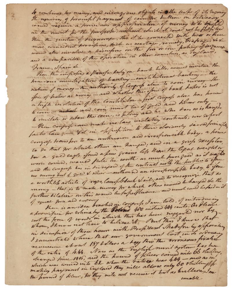 He goes on to offer commentary on the banking system: "Congress alone has power to coin—and coin must be of gold and silver only—to imitate or debase the coin, is felony and he who does so is hanged—Then Congress can make no law violating contracts, nor ex post facto law;—yet in opposition to those obviously sacred principles, Congress transfers to an unknown and irresponsible body, a power to do that for which others are hanged; and in gross excess too, for a gold eagle issued a few grains less than the legal weight or worse coined, would?be worth as much as it weighed and the Congress has in disregard of the contract with the public to issue no money but of gold & silver—authorized an irresponsible body to issue a worthless article." In very good to fine condition, with partial separations to folds, overall toning, and scattered creases and staining.