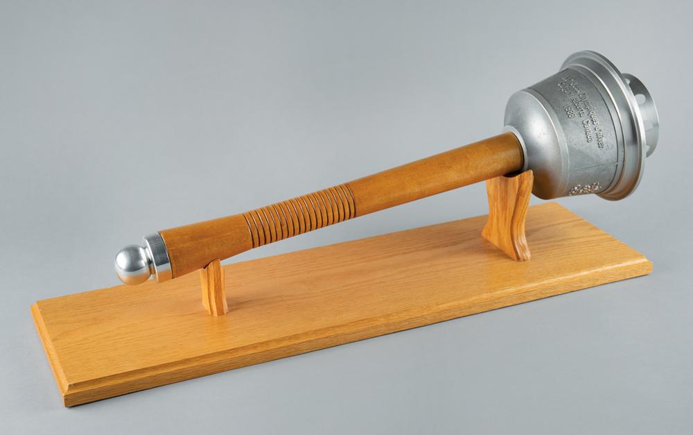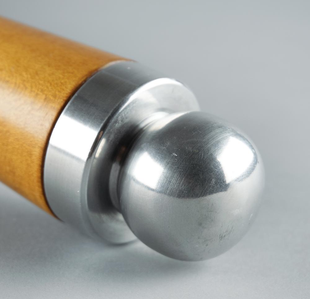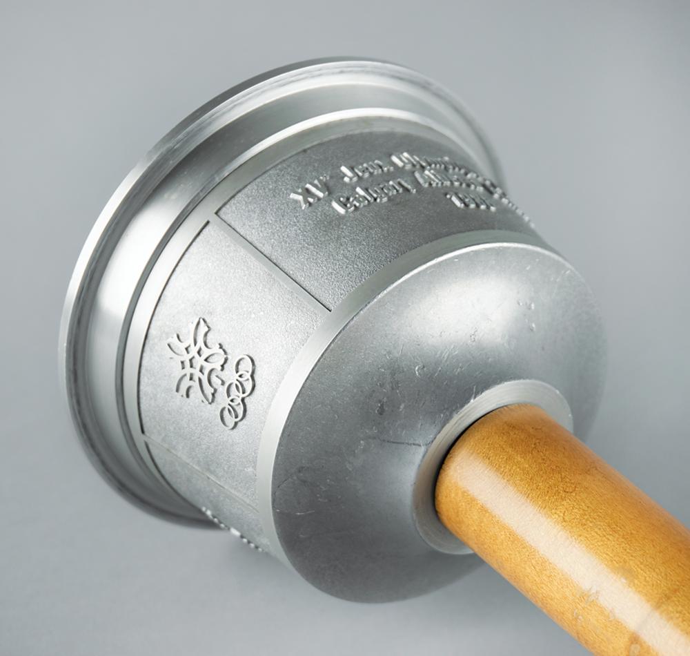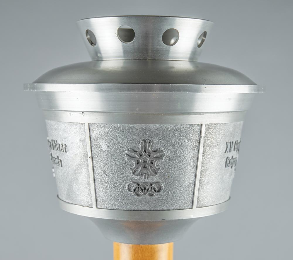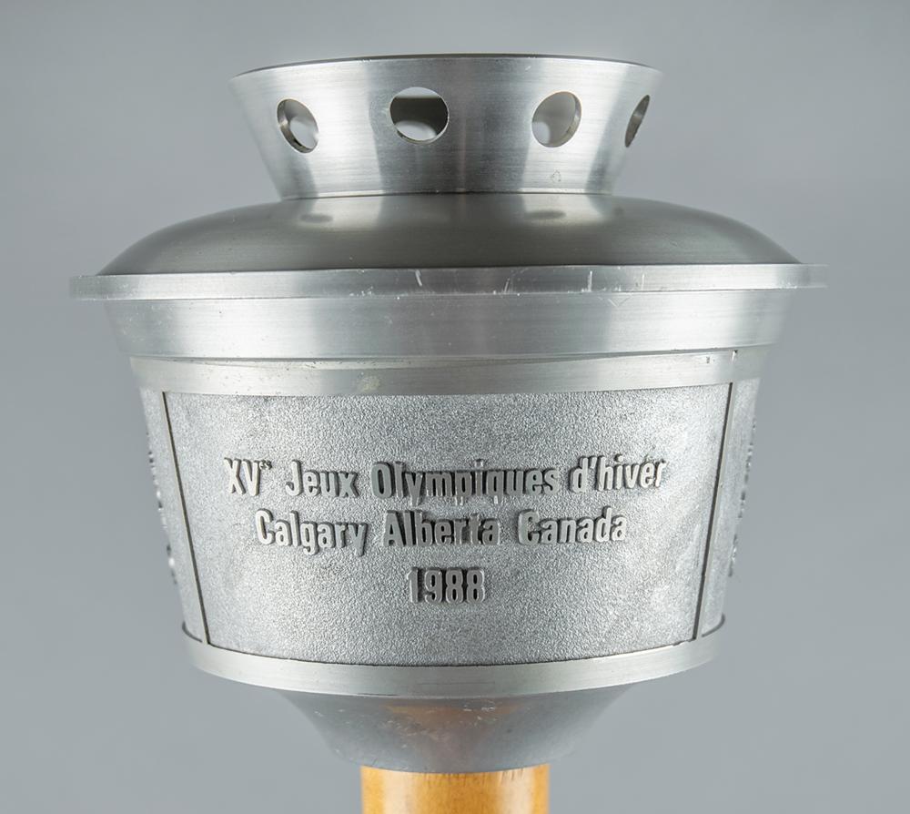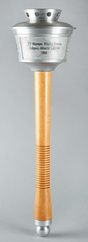 Rare heavyweight prototype of the Calgary 1988 Winter Olympics torch. Comprised of aluminum with a maple handle, the torch measures 24.5″ in length and 7″ at its widest point, with the top inscribed with the games emblem and raised text in English and French, “XV Olympic Winter Games, Calgary Alberta Canada, 1988.” This robust preliminary torch was designed by the National Research Council of Canada and made to resemble the Calgary Tower, an iconic landmark in the Canadian city. Although they outwardly appear quite similar, there exists a variety of notable differences between this larger mock-up and the final, more user-friendly result. The prototype is larger and heavier—length (24.5″ to 23.5″), width (7″ to 6.5″), weight (4.75 lbs to 2.7 lbs)—and is also missing engravings to the underside of the bowl and to the ball at the base of the handle, which is likewise not emblazoned with pictograms of Winter Olympic sports; the girth and color of the handle, in addition to the number and spacing of its etched rings, is markedly different. The bowl itself does not appear polished like its successor, with its eight upper burner holes recessed, unlike the four protruding wick casements present on the final burner. Also, the bowl appears bolt-attached, whereas the bowl to the relay-used torch utilizes a twist-spring action release. The prototype features a few light scuffs and marks to the upper handle and underside of the bowl. Accompanied by a custom-made torch stand.