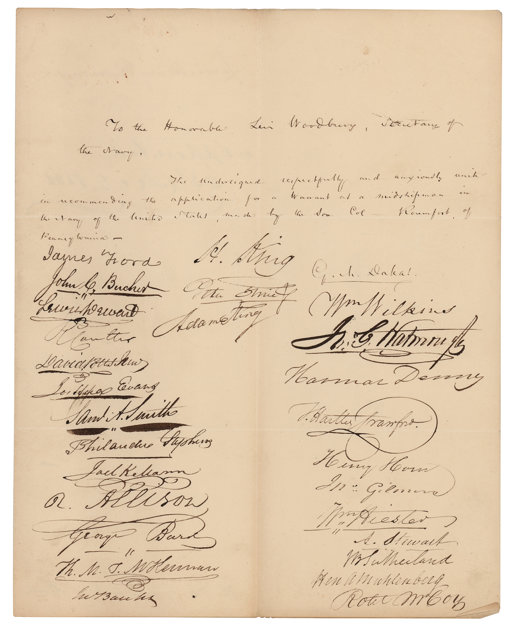 Politician and diplomat (1792-1864) who served as Vice President under James K. Polk from 1845 to 1849; the city of Dallas, Texas, is said to be named for him. ADS signed "G. M. Dallas," one page, 8 x 10, no date. Dallas writes out a petition to "the Honorable Levi Woodbury, Secretary of the Navy," in full: "The undersigned respectfully and anxiously write in recommending the application for a Warrant as a midshipman in the Navy of the United States, made by the Hon. Col. Raumfort, of Pennsylvania." In addition to Dallas, the petition is signed by 27 other Pennsylvania politicians, most whom represented the state in the 21st or 22nd United States Congress: James Ford, John C. Bucher, Lewis Dewart, Richard Coulter, David Potts, Jr., Joshua Evans, Jr., Samuel A. Smith, Philander Stephens, Joel K. Mann, Robert Allison, George Burd, Thomas M. T. McKennan, John Banks, William Wilkins, John G. Watmough, Harmar Denny, Thomas H. Crawford, Henry Horn, John Gilmore, William Hiester, Andrew Stewart, Joel B. Sutherland, Henry A. P. Muhlenberg, Robert McCoy, Henry King, Peter Ihrie, Jr., and Adam King. In fine condition.