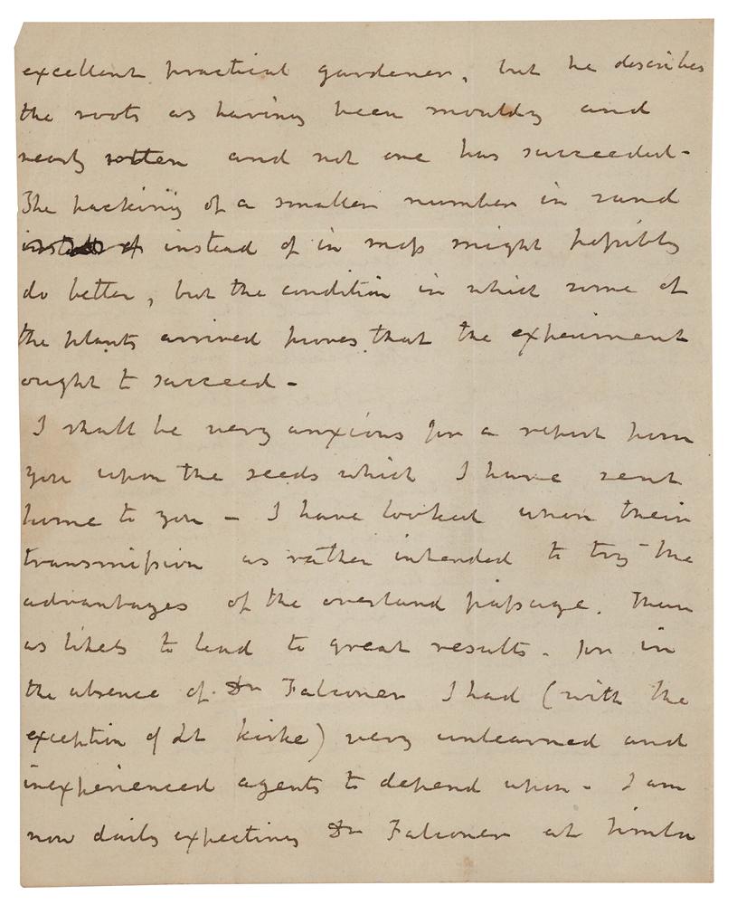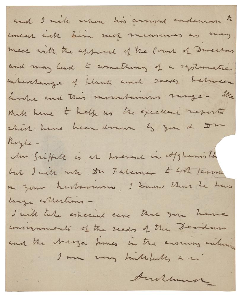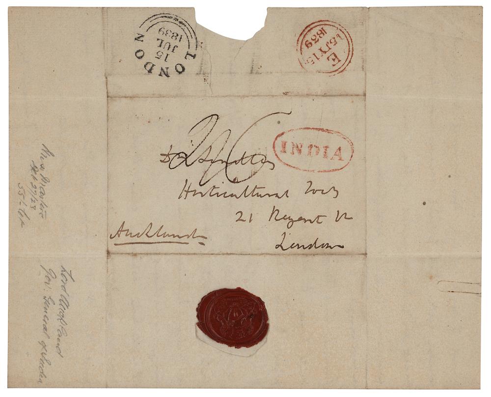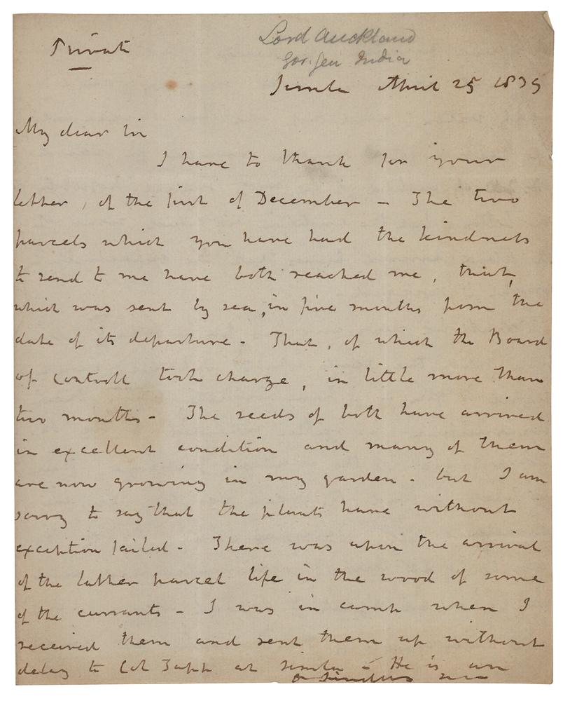 English Whig nobleman and colonial administrator (1784-1849) who served three times as First Lord of the Admiralty and who was Governor-General of India between 1836 and 1842, dedicating himself especially to the improvement of native schools and the expansion of the commercial industry of India. ALS signed “Auckland,” three pages on two adjoining sheets, 7.25 x 9, April 25, 1839. Handwritten letter marked "Private," in part: "I have to thank you for your letter of the first of December—the two parcels which you have had the kindness to send to me have both reached me…The seeds of both have arrived in excellent condition and many of them are now growing in my garden, but I am sorry to say that the plants have without exception failed…I shall be very anxious for a report from you upon the seeds which I have sent home to you." He goes on to say that he hopes to establish "a systematic interchange of plants and seeds between Europe and this mountainous range." Addressed on the integral leaf in Eden's hand and franked in the lower left, "Auckland." In fine condition, with a seal-related tear and paper loss to the second page.