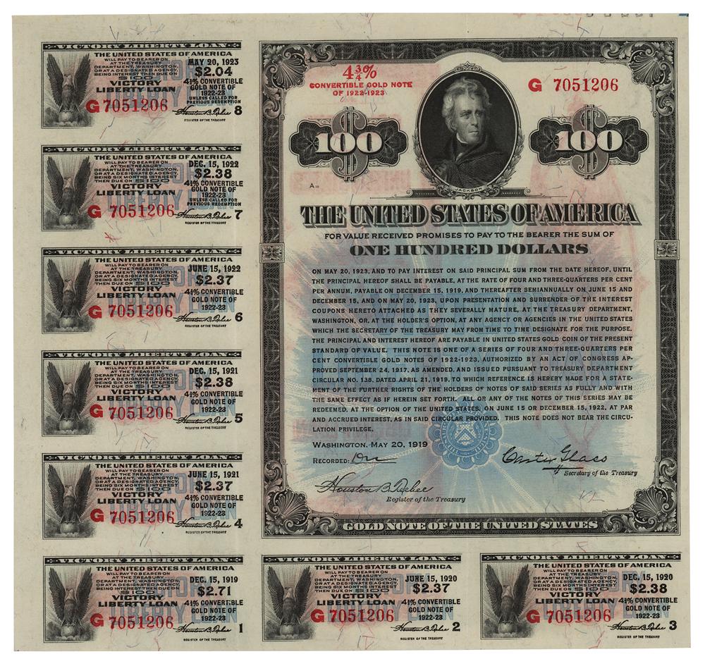 Extremely rare $100 Victory Liberty Loan Bond issued on May 20, 1919, complete with eight coupons. This four-year note carried a 4.75% interest rate and bears the facsimile signatures of the Secretary of the Treasury and the Register of the Treasury, with a vignette of President Andrew Jackson at the top. Despite an original issuance of $4.5 billion, this is just one of four known examples. In fine condition.