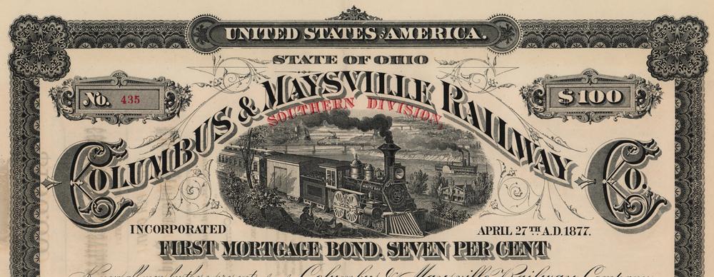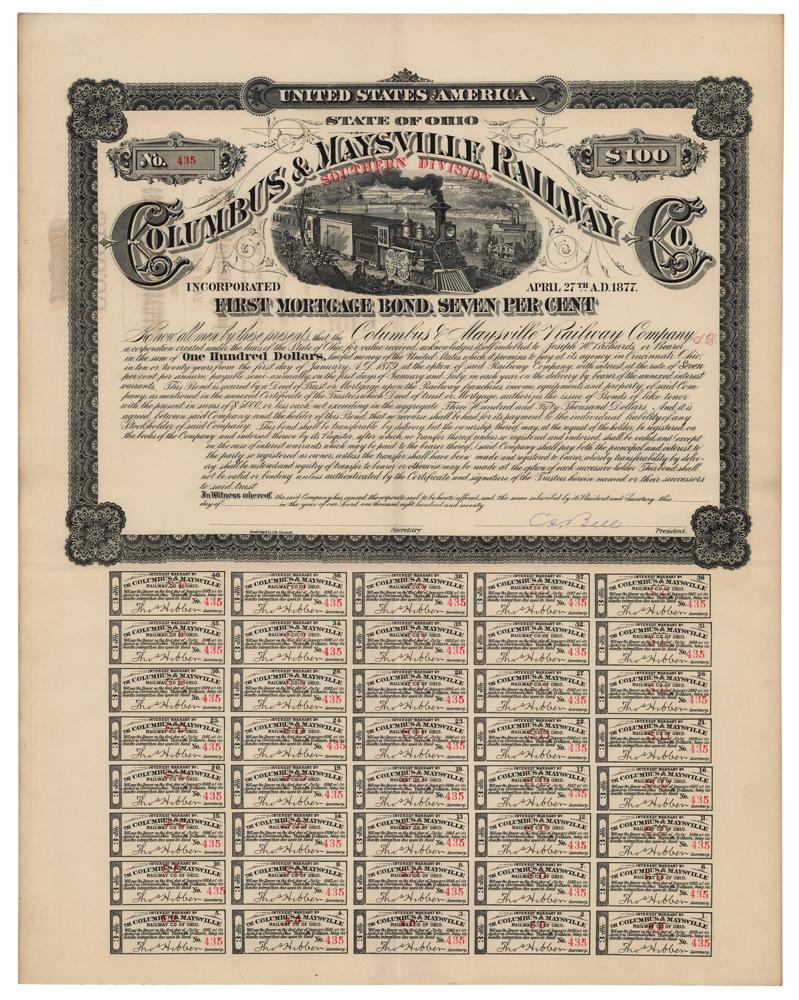 Partly-printed DS, one page, 16.5 x 21, [1870s]. First mortgage bond of the Columbus & Maysville Railway Company "Southern Division" in the amount of $100, signed at the conclusion by C. S. Bell as president. The lower portion retains all 40 of its coupons, and the upper section features a handsome vignette of a locomotive. In fine, folded condition.