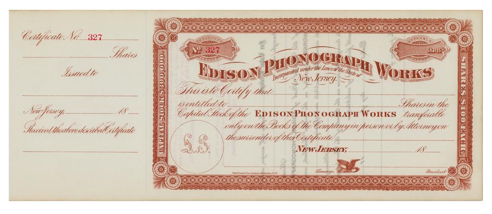 Unissued stock certificate for the Edison Phonograph Works, one page, 10 x 5.75, no date but circa 1888. The perforated receipt on the left edge remains intact. These certificates were issued to and signed by Thomas Edison, though this one is blank. In fine condition. A scarce unissued certificate.