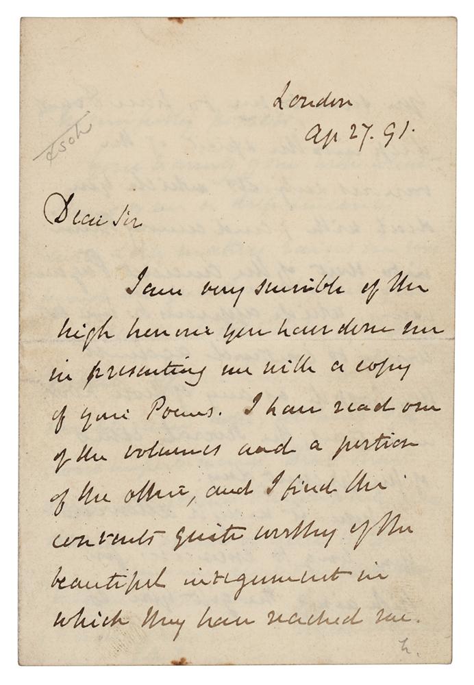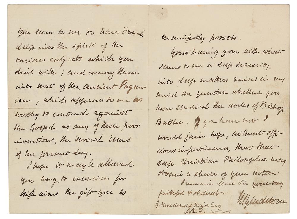 British statesman (1809-1898) who served as prime minister on four separate occasions between 1868 and 1894. ALS signed “W. Gladstone,” three pages, 4 x 6, April 27, 1891. Handwritten letter to Scottish author and poet George MacDonald, in part: "I am very sensible of the high honour you have done me in presenting me with a copy of your Poems. I have read one of the volumes and a portion of the other, and I find the contents quite worthy." He praises the depth of MacDonald's work, comments on the "Ancient Paganism" subject matter, and asks if he has studied the works of Bishop Butler. In fine condition.