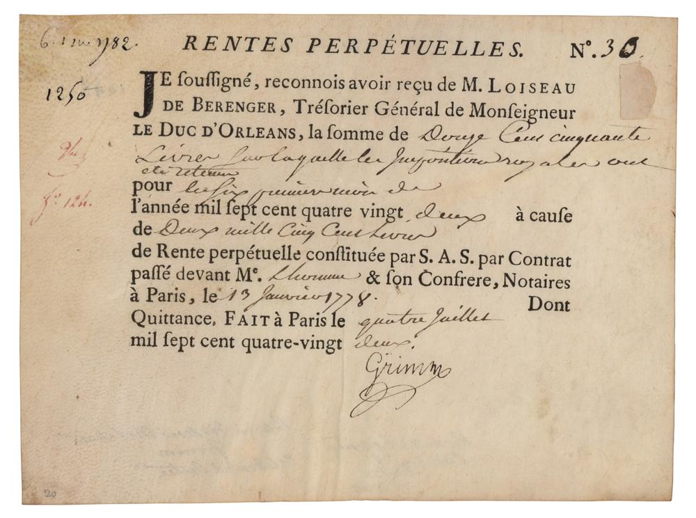 German-born French-language journalist, art critic, and diplomat (1723-1807) remembered as a contributor to the 'Encyclopédie ou Dictionnaire raisonné des sciences, des arts et des métiers' and for his interest in opera reform. Partly-printed vellum DS, in French, signed "Grimm," one page, 7.5 x 5.75, January 13, 1778. A "Perpetual Annuities" receipt, acknowledging receipt of funds from "M. Loiseau de Berenger, General Treasurer of Monseigneur the Duke of Orleans." In fine condition, with a mounting remnant to upper right corner.