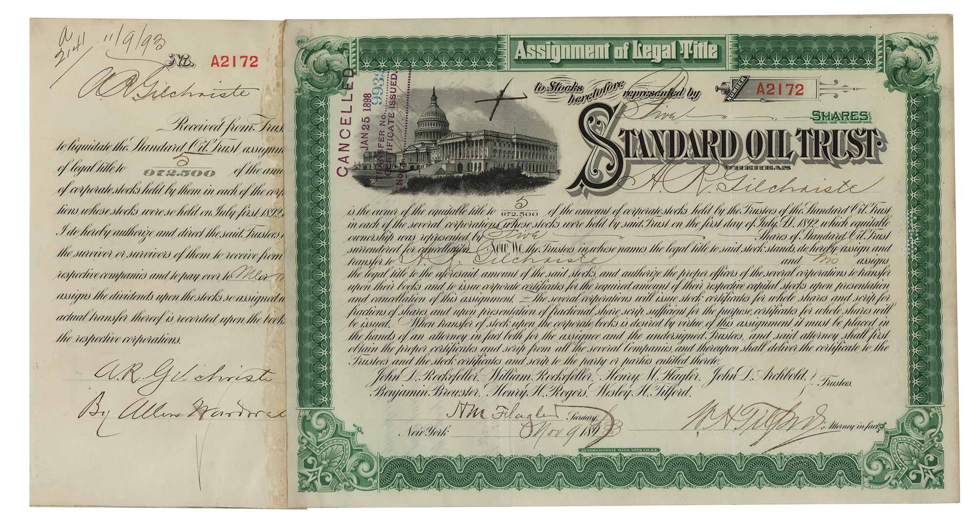 Partly-printed DS, signed “H. M. Flagler" and "W. H. Tilford,” one page, 10.75 x 7.75, November 9, 1893. Stock certificate for five shares in the Standard Oil Trust issued to A. R. Gilchriste, signed in ink by Wesley H. Tilford as attorney in fact and Henry M. Flagler as secretary. The original receipt remains affixed to the left edge. In fine condition.