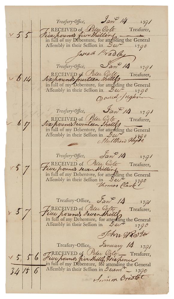 Uncut sheet of six pay orders received by Connecticut’s Treasury Office, one page, 7.25 x 12.75, January 14, 1791. The pay orders are issued to Josiah Bradley, David Ingham, Matthew Hyde, Thomas Clark, Simeon Bristol, and one other, for attending “the General Assembly in their Session” in December 1790. Each pay order is signed by Treasurer Peter Colt, grandfather of the famous Connecticut inventor and firearms developer, Samuel Colt. In fine condition.
