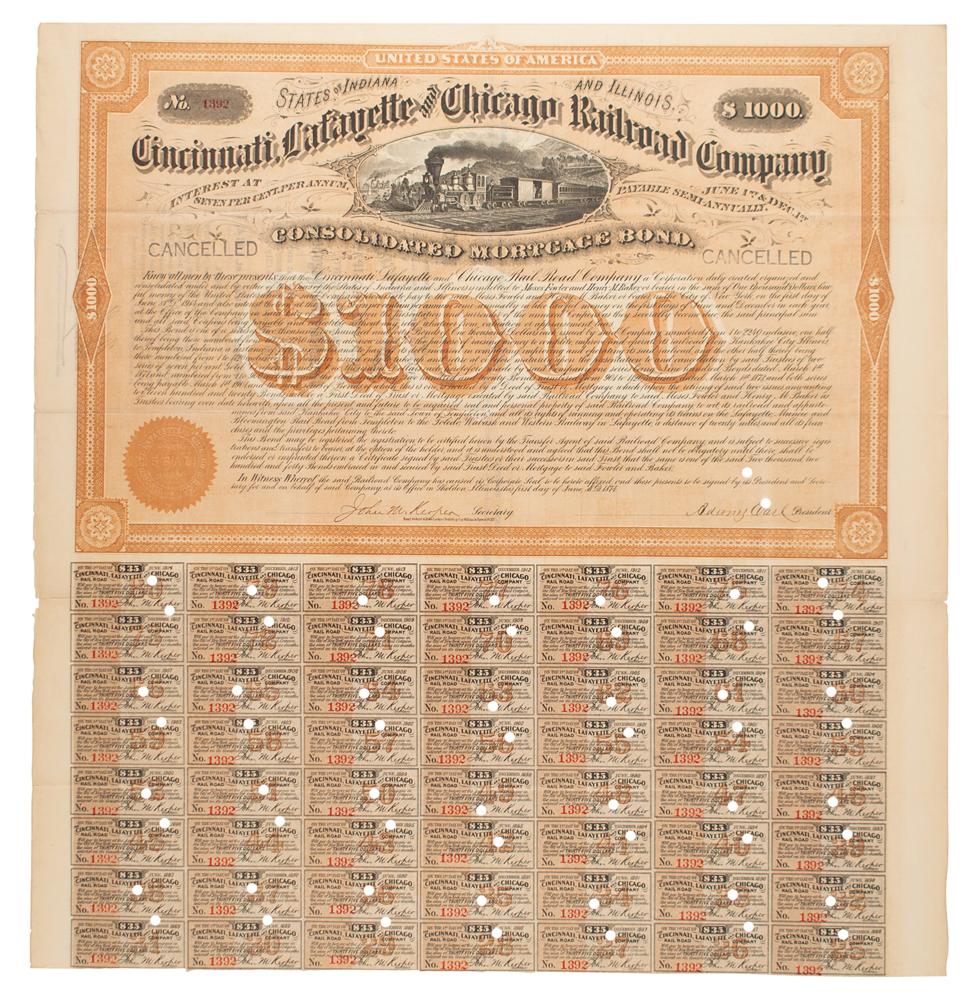 Canceled $1000 antique bond of the Cincinnati, Lafayette and Chicago Railroad Company (brown variety) issued June 1, 1874, 19 x 19.5, with 56 coupons intact below. Carrying an annual rate of 7%, the consolidated mortgage bond features a beautiful vignette of a train steaming past a group of workers alongside a river. Printed by Henry Seibert & Bros., the document is signed at the conclusion by Adams Earl as the company president. In fine condition, with partial separations to the intersecting folds.