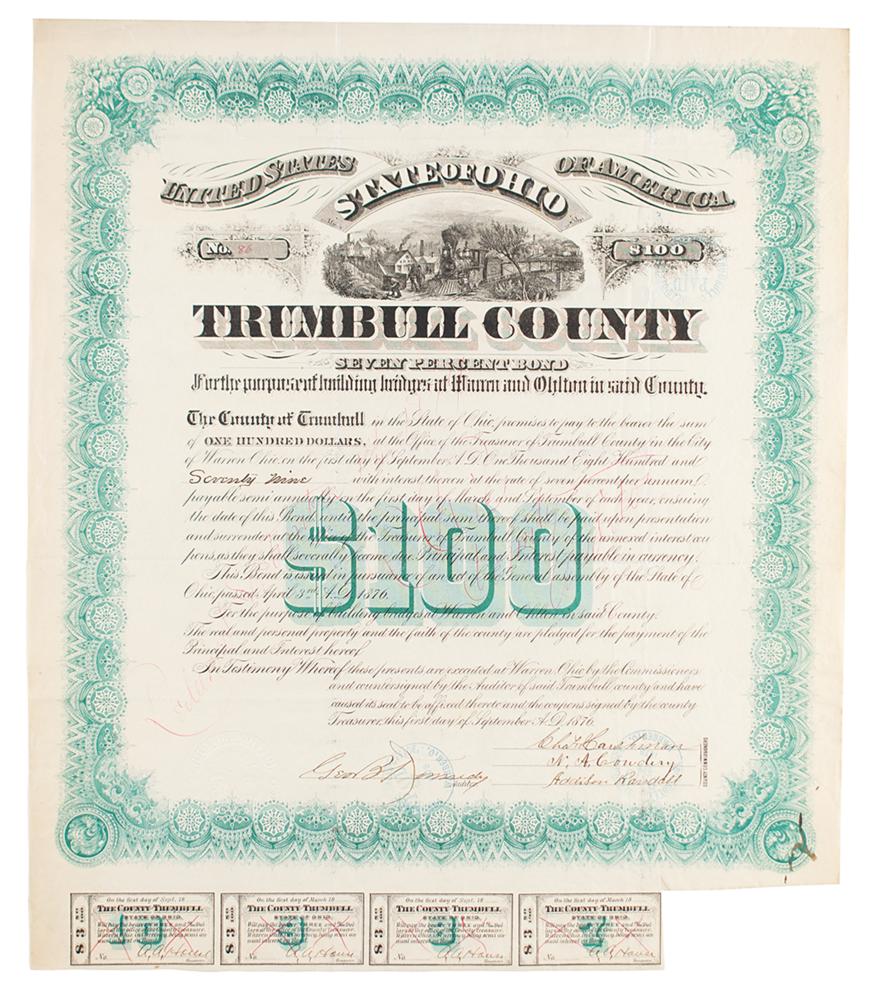 Handsomely engraved seven percent bond for Trumbull County of the State of Ohio, one page, 14.5 x 17, September 1, 1879, issued in the amount of $100 for “the purpose of building bridges at Warren and Ohlton in said County.” Lower left bears an embossed Auditor’s Office stamp, and the bottom retains four $3 bond coupons. The upper portion features an attractive vignette of a train crossing a bridge into a coal town. In fine condition.