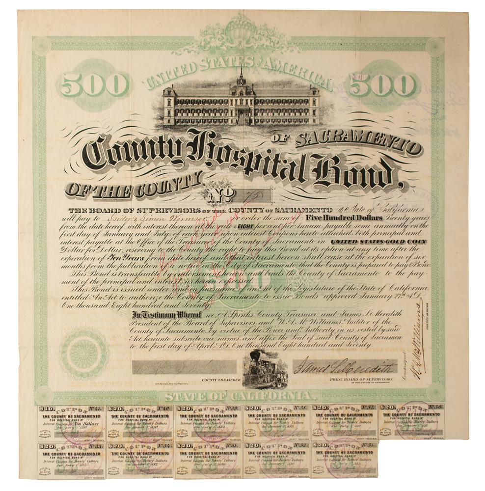 Handsome $500 County Hospital Bond of Sacramento, California, 14 x 14.75, with eleven coupons intact below. Payable in "United State Gold Coin" at 8%, the bond features a custom vignette of the hospital and is signed in ink by three county officials. In fine condition.