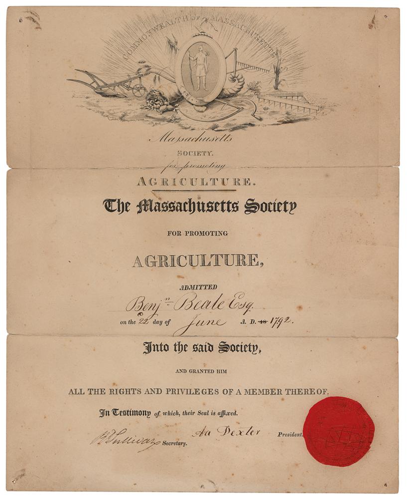 DS, one page, 10.75 x 13.25, June 2, 1792. Certificate for the admission of Benjamin Beale into the Massachusetts Society for Promoting Agriculture, signed at the conclusion by the organization's president and secretary. The red wax seal is cracked but intact. In very good to fine condition, with scattered foxing, and repairs to complete separations along the horizontal folds.