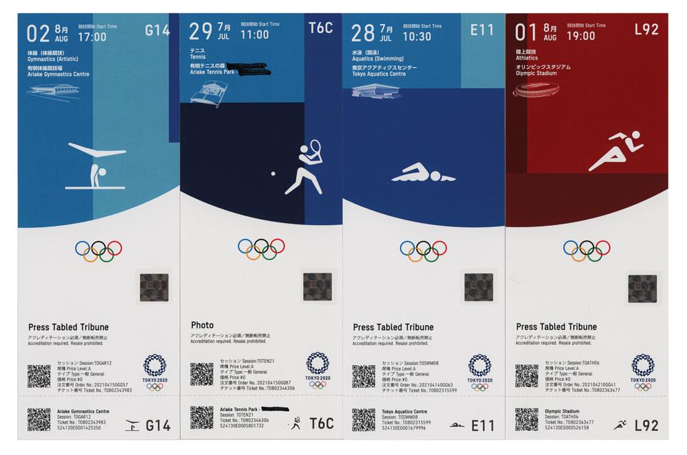 Four original 3 x 7.75 full tickets to the Tokyo 2020 Summer Olympics, for the following events: Aquatic (Swimming), Athletics (Track and Field), Gymnastics (Artistic), and Tennis. Three are identified as "Press Tabled Tribune," and one as "Photo." As there were no spectators and ticket brokers returned their supply, the only Tokyo tickets officially issued were for press or media. Only a few sports, which had limited seating or photo positions, required media tickets and these were scanned at the entrance. In mint condition, with Tokyo organizers marking venue locations on the tennis ticket in felt tip.