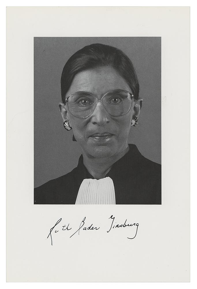 Semi-glossy 6 x 9 paperstock photo of Ruth Bader Ginsburg in her judicial robe, signed in the lower border in thin black felt tip. In fine condition, with a small crease on her right shoulder.