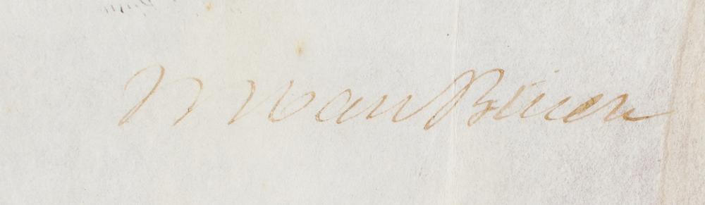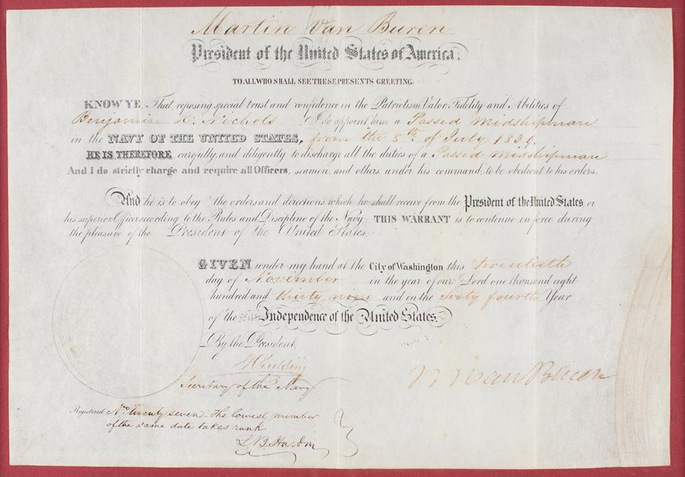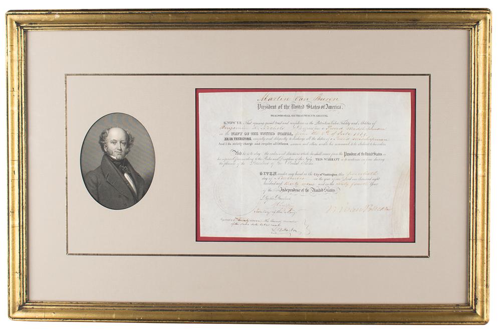 Partly-printed DS, signed "M. Van Buren," one page, 10 x 7, November 20, 1839. President Van Buren appoints Benjamin N. Nichols as "a Passed Midshipman in the Navy of the United States." Nearly signed at the conclusion by President Van Buren and countersigned by Secretary of the Navy James Kirke Paulding. Nicely matted and framed with a portrait to an overall size of 23.5 x 15. In fine condition, with an area of creasing to the lower right, and the signature slightly faded.