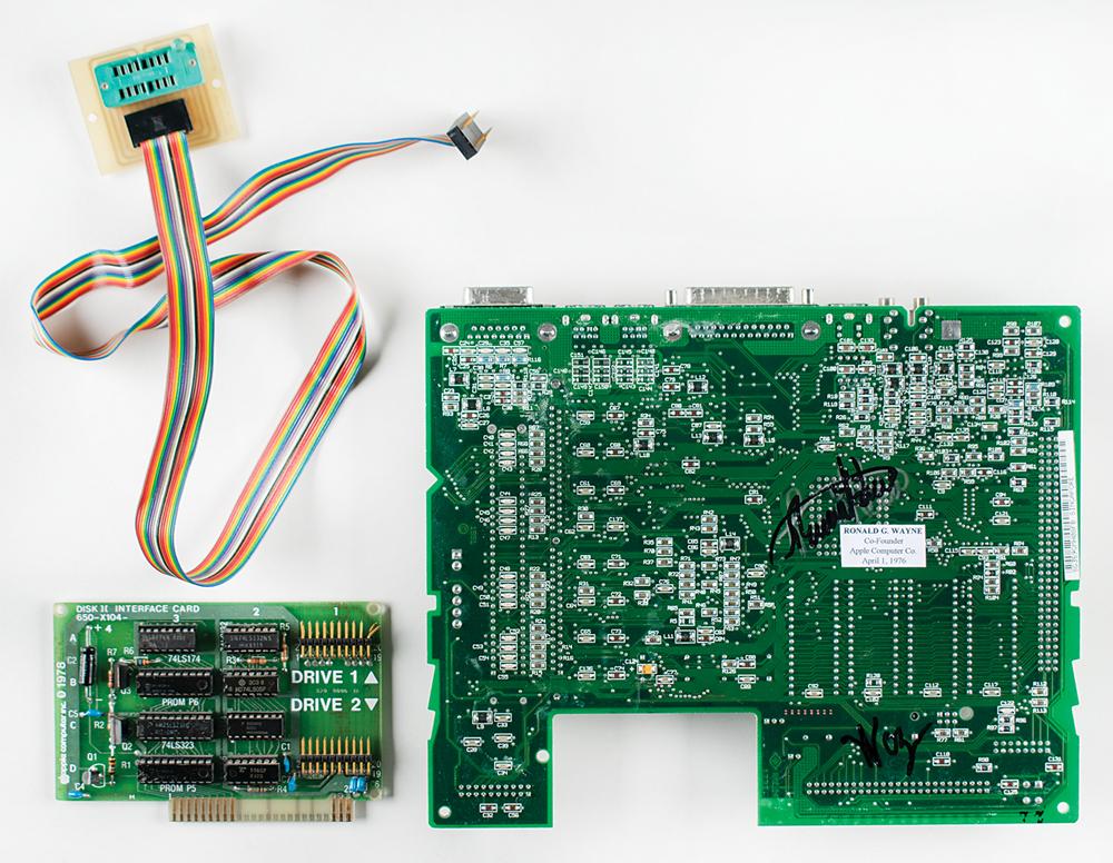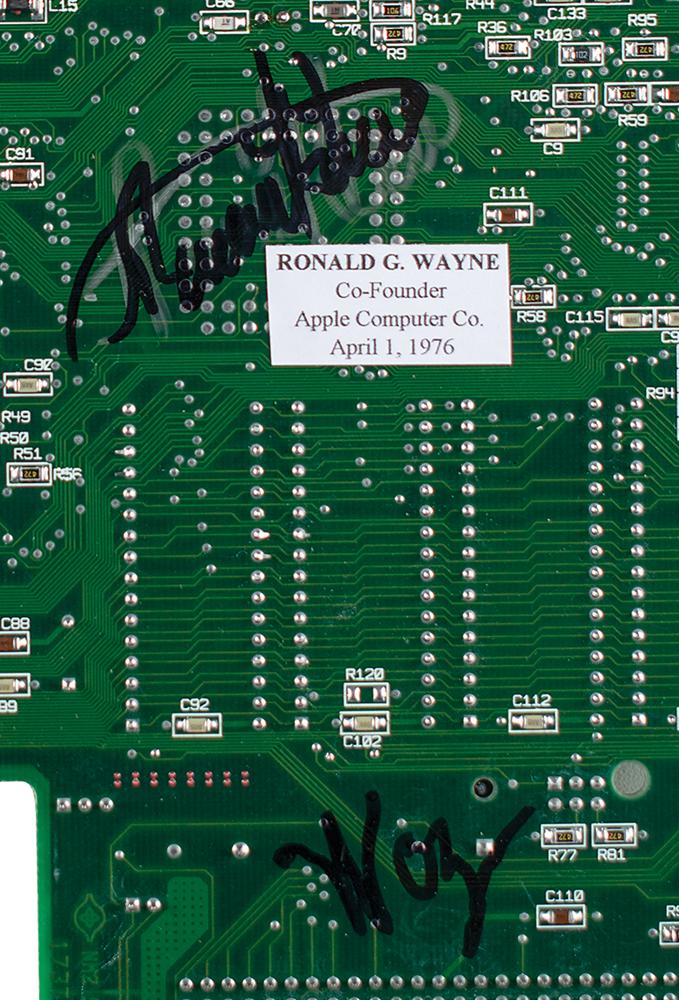Apple computer circuit board, 8.75 x 7 x 1, signed in black felt tip by Steve Wozniak, "Woz," and by Ronald Wayne, "Ronald G. Wayne," who signs over a small affixed caption. In fine condition.