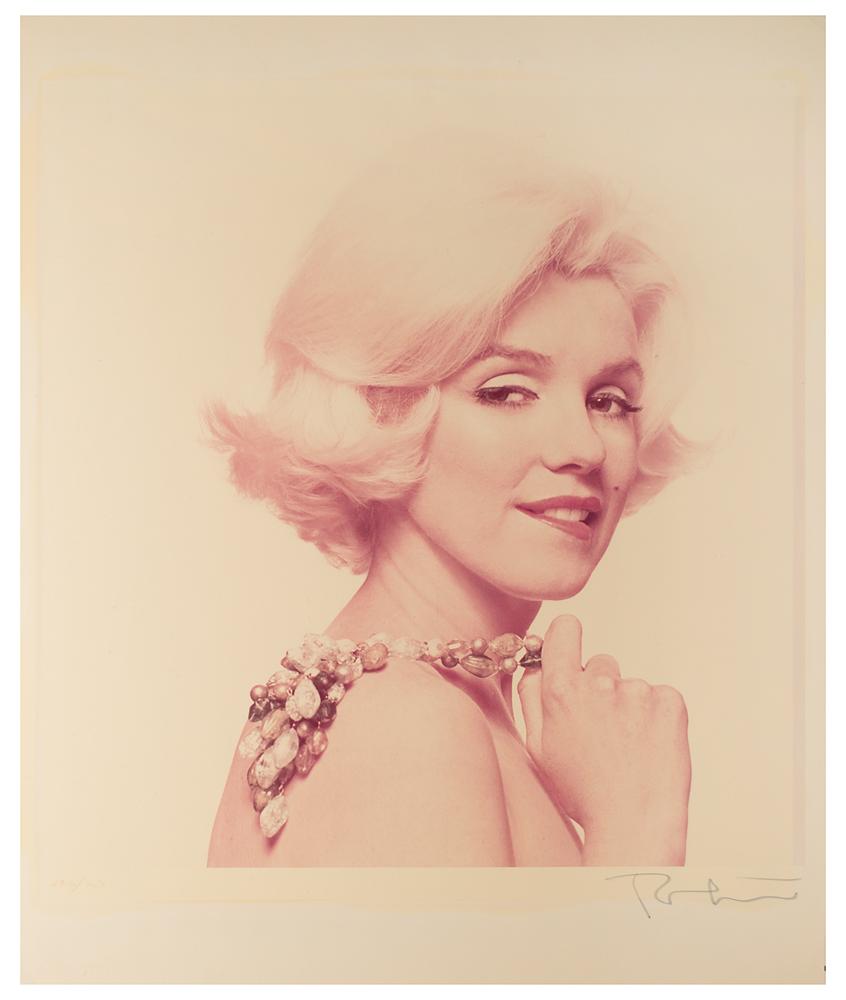 Limited edition color semi-glossy 20 x 24 silver gelatin photo of Marilyn Monroe from the 1962 Bert Stern suite, ‘The Last Sitting,’ published by William Morrow and Company, New York. The photo depicts Marilyn holding beads, looking over shoulder, and biting her lower lip, numbered 102/250, signed in the lower border in felt tip by Stern. In fine condition, with slight overall fading, and toning from prior display.