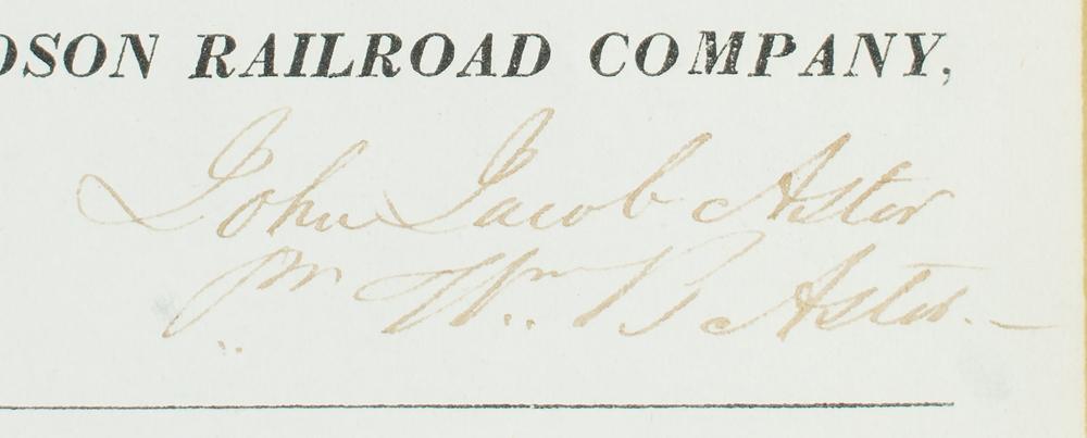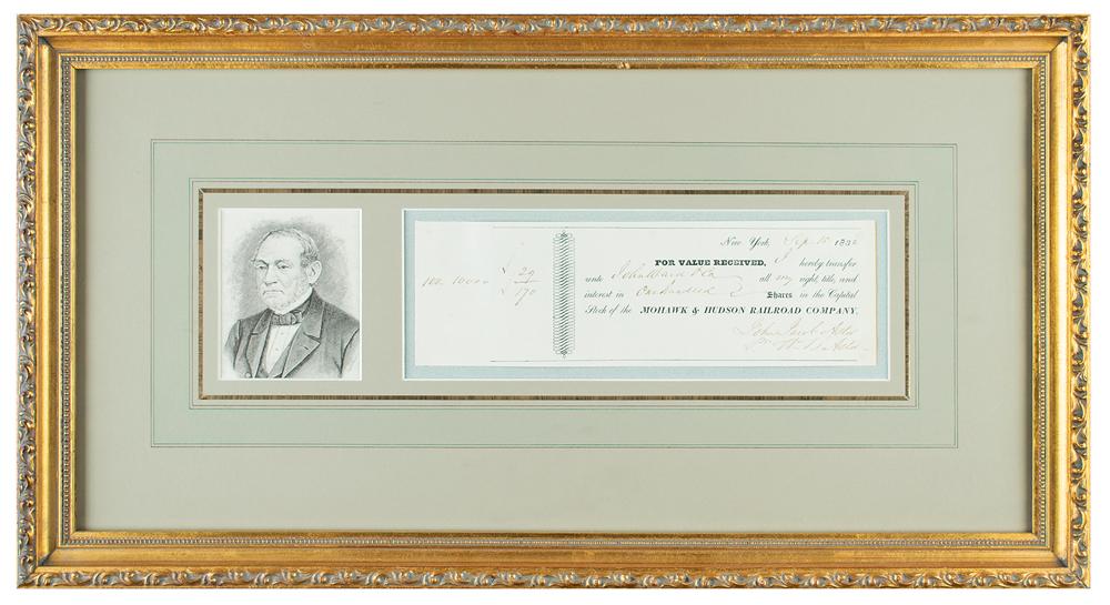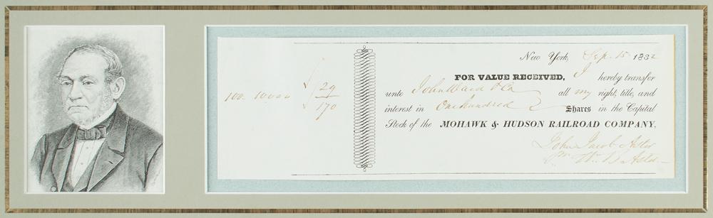 American property tycoon (1792-1875) who inherited most of his father John Jacob Astor's fortune and earned the nickname 'the landlord of New York.' Partly-printed DS, signed “John Jacob Astor pr. Wm. B. Astor,” one page, 9.5 x 3, September 15, 1832. Receipt transferring all "right, title, and interest in one hundred shares in the Capital Stock of the Mohawk & Hudson Railroad Company," signed at the conclusion by William Backhouse Astor, Sr., on behalf of his father. Mounted, matted, and framed with a portrait to an overall size of 22 x 12. In fine condition.