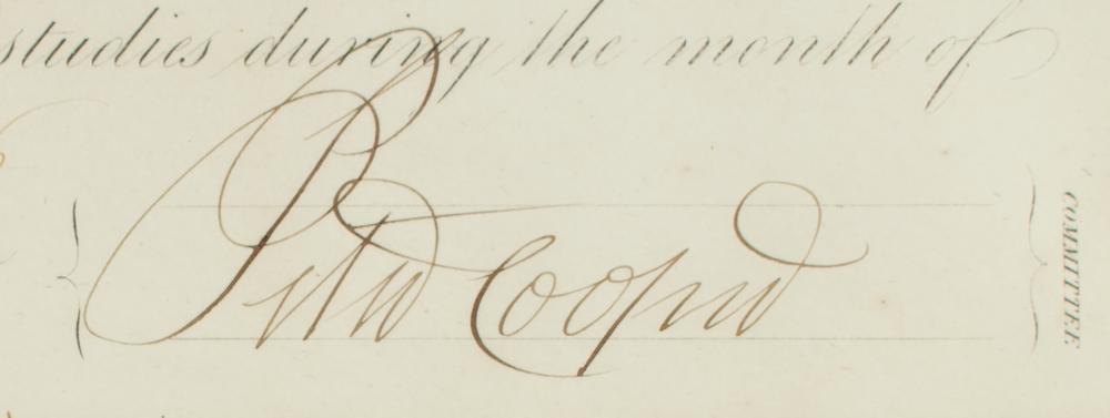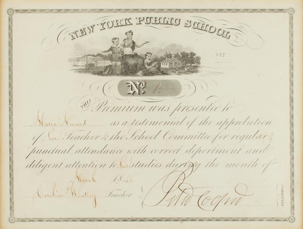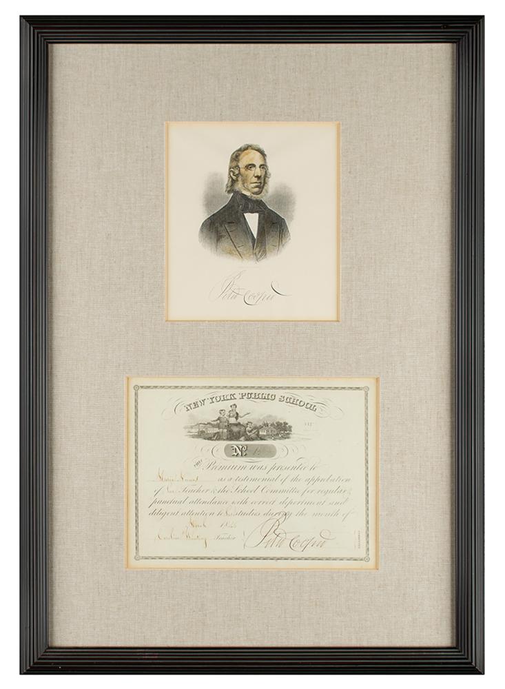 Versatile American industrialist, inventor, and politician (1791-1883) who designed the first steam locomotive built in the United States. Partly-printed DS, one page, 8.75 x 6.75, March 1846. New York Public School certificate, in part: "This Premium was presented to Maria Nunns as a testimonial of the approbation of her Teacher & the School Committee for regular & punctual attendance with correct deportment and diligent attention to her studies during the month of March 1846." Signed at the conclusion by Cooper as a committee member, and by the teacher, Caroline Whiting. Matted and framed with a portrait bearing a facsimile signature to an overall size of 16.25 x 23.25. In fine condition.