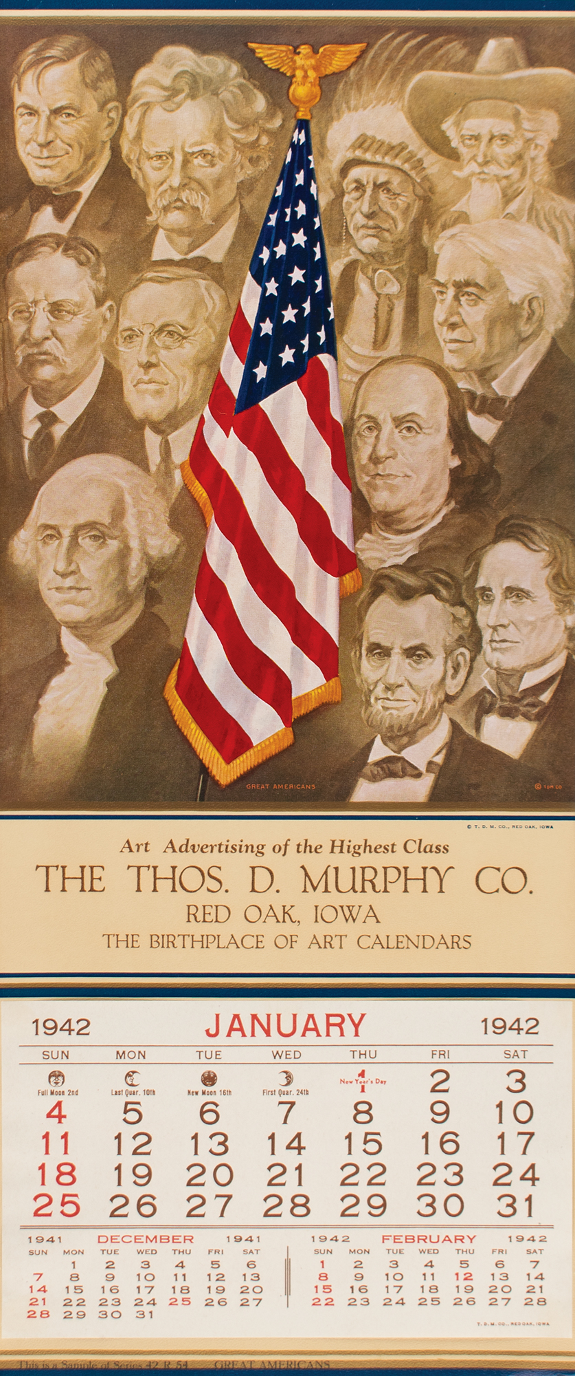 Colorful World War II-dated 7.75 x 18.5 salesman's sample of a calendar for January 1942 entitled 'Great Americans,’ with main artwork of an American flag surrounded by images of famous Americans like George Washington, Abraham Lincoln, Benjamin Franklin, Thomas Edison, Mark Twain, and more. Printed by the Thos. D. Murphy Co., Red Oak, Iowa. In fine condition.