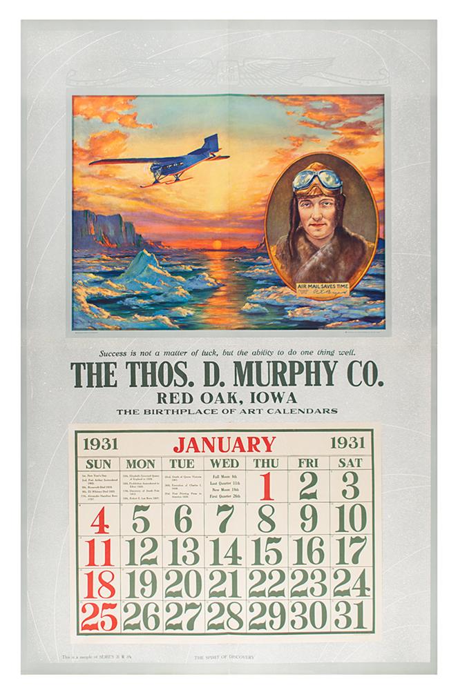 Vibrant oversized color 26.75 x 42.25 salesman's sample of a calendar for January 1931 entitled 'The Spirit of Discovery,' featuring a great portrait of Byrd set against a dramatic rendering of his seaplane soaring over arctic waters. Printed by the Thos. D. Murphy Co., Red Oak, Iowa. In fine condition, folded as issued.