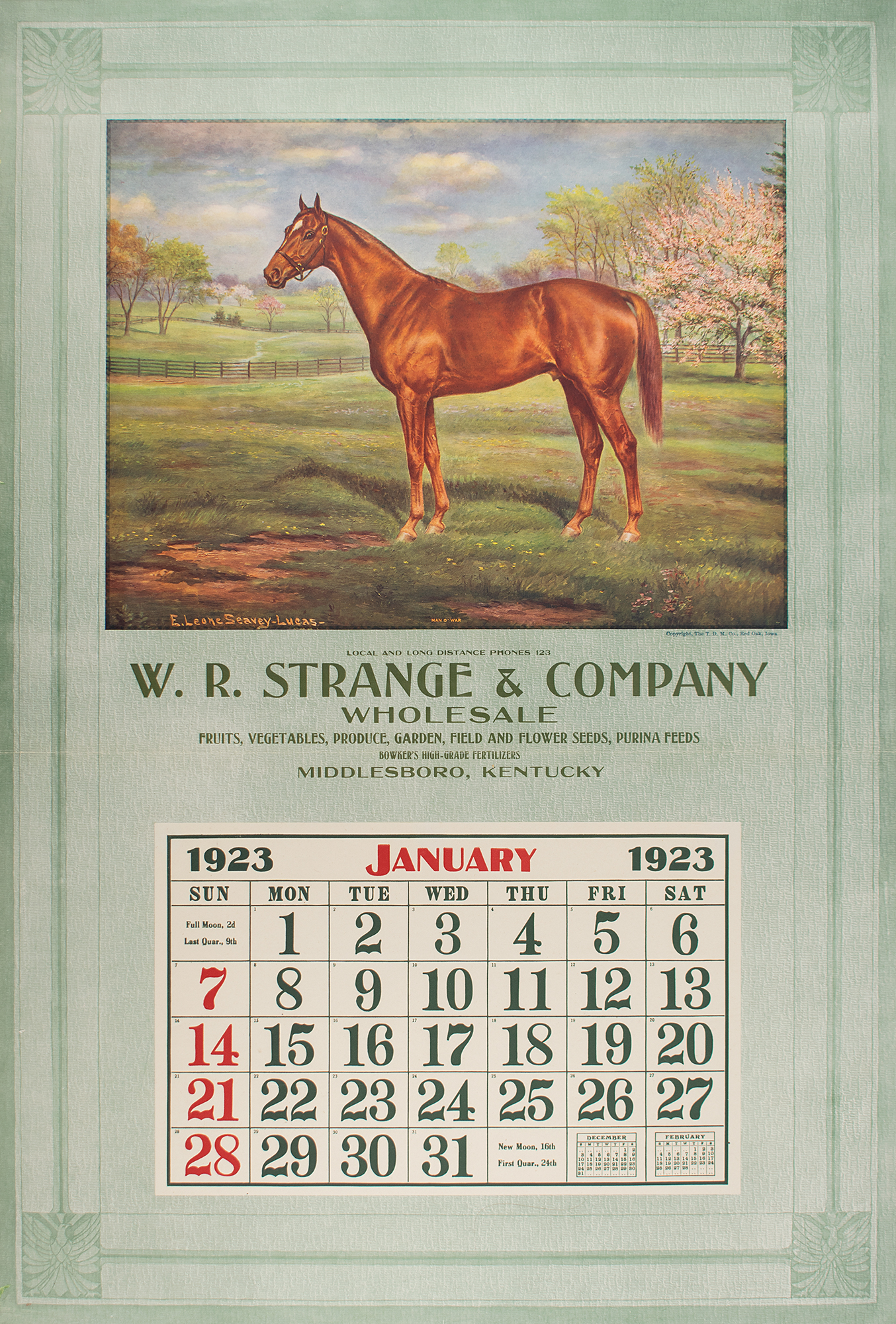 Color oversized 21.25 x 31.5 salesman's sample of a calendar for January 1923 entitled ‘Man o’ War,’ featuring artwork by Essie Leone Seavey Lucas of the legendary Thoroughbred racehorse. Text above the calendar reads: “Local and Long Distance Phones 123, W. R. Strange & Company, Wholesale?Middlesboro, Kentucky.” Printed by the Thos. D. Murphy Co. of Red Oak, Iowa. In fine, folded condition, with some edgewear.