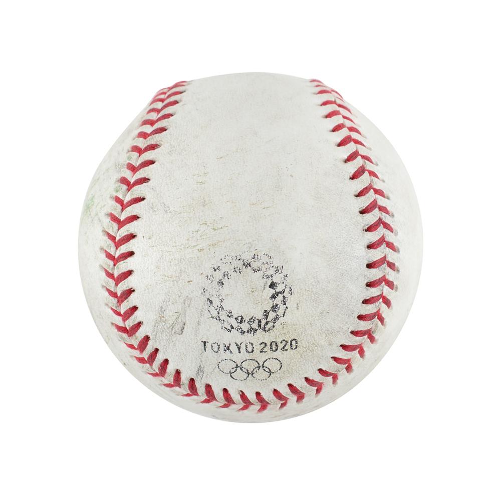 Official game-used SSK WBSC 540 baseball from the Tokyo 2020 Summer Olympics, with a side panel featuring the emblem of the XXXII Olympiad. In fine condition, with scattered scuffs, wear, and grass stains.