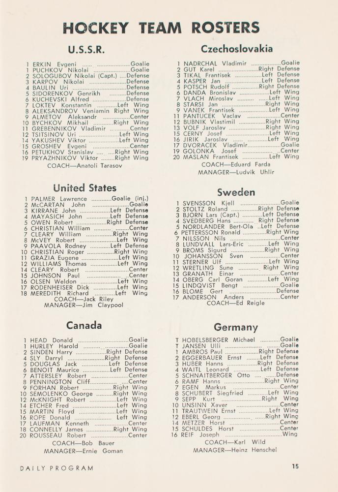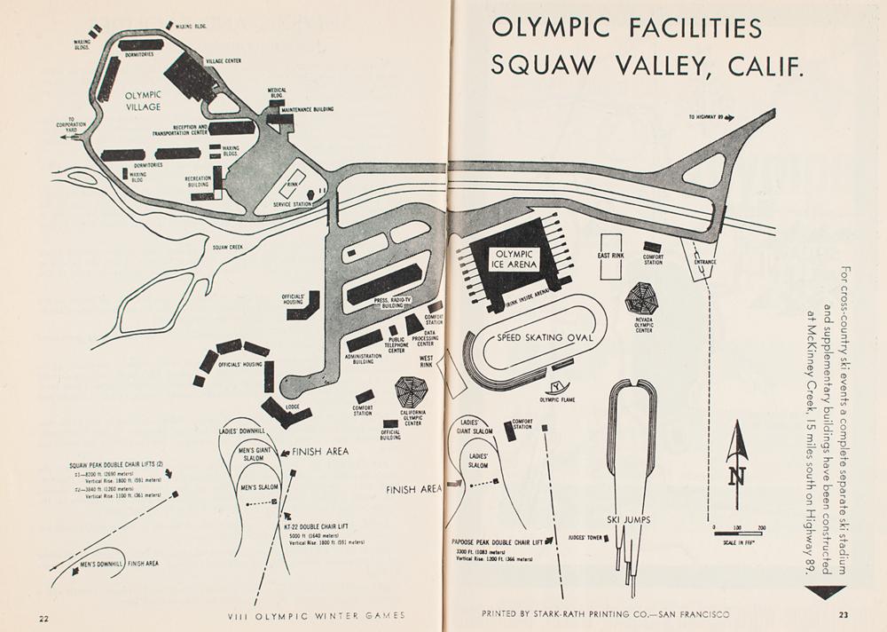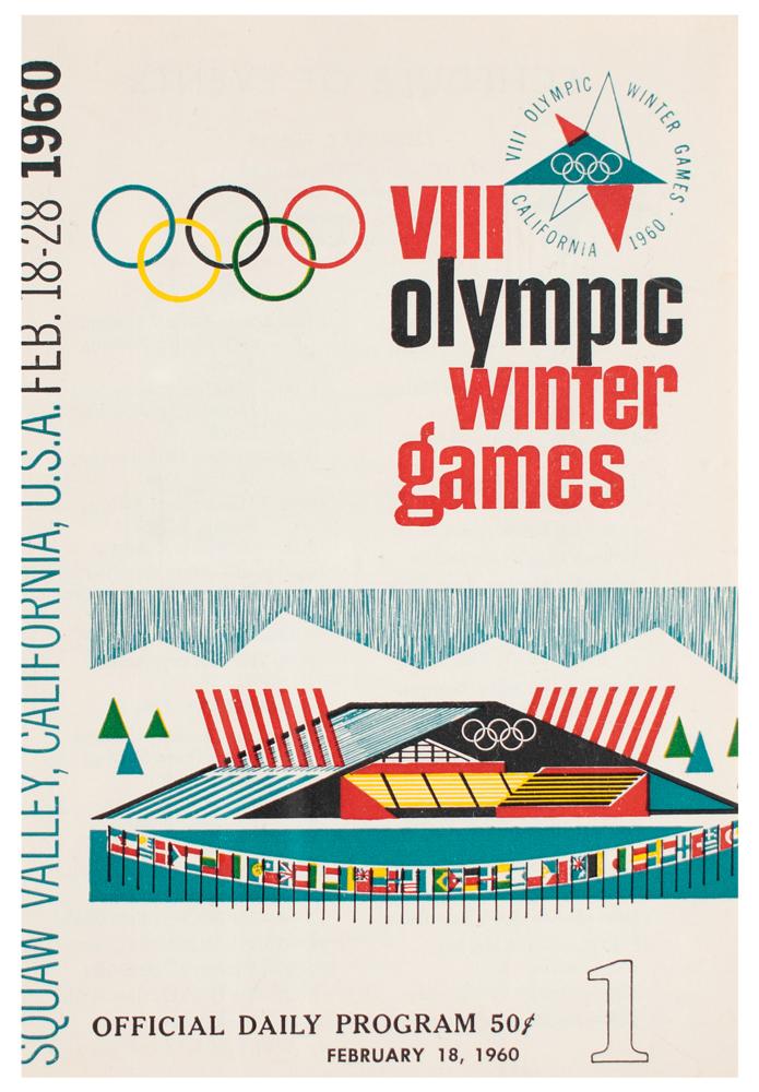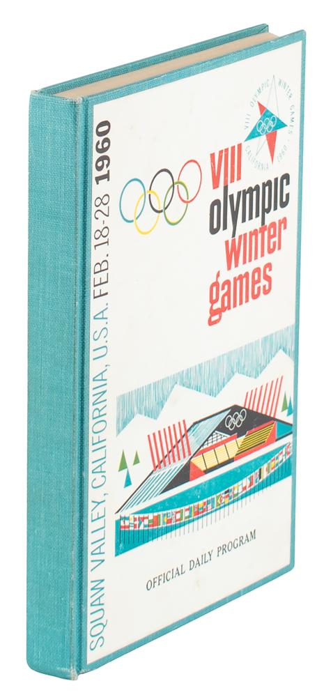 Unusual custom-bound hardcover book containing all 11 official daily programs from the Squaw Valley 1960 Winter Olympics, which ran from February 18 to 28, 1960. The book measures 5.25 x 7.25, contains 252 pages, and features a 4-page appendix for results of February 28th. In fine condition, with some binding wear to opening pages. A scarce and specially bound program book that comprehensively covers the Squaw Valley Olympiad.