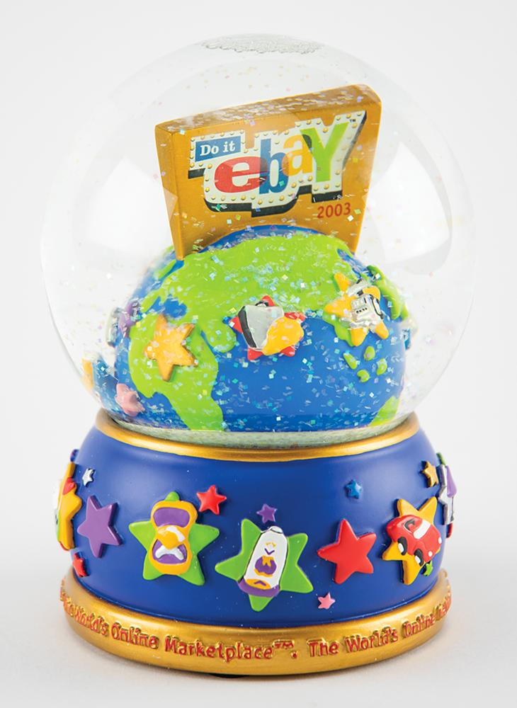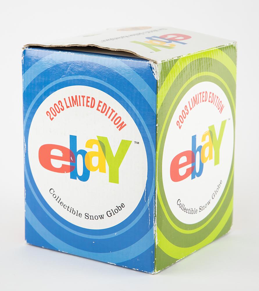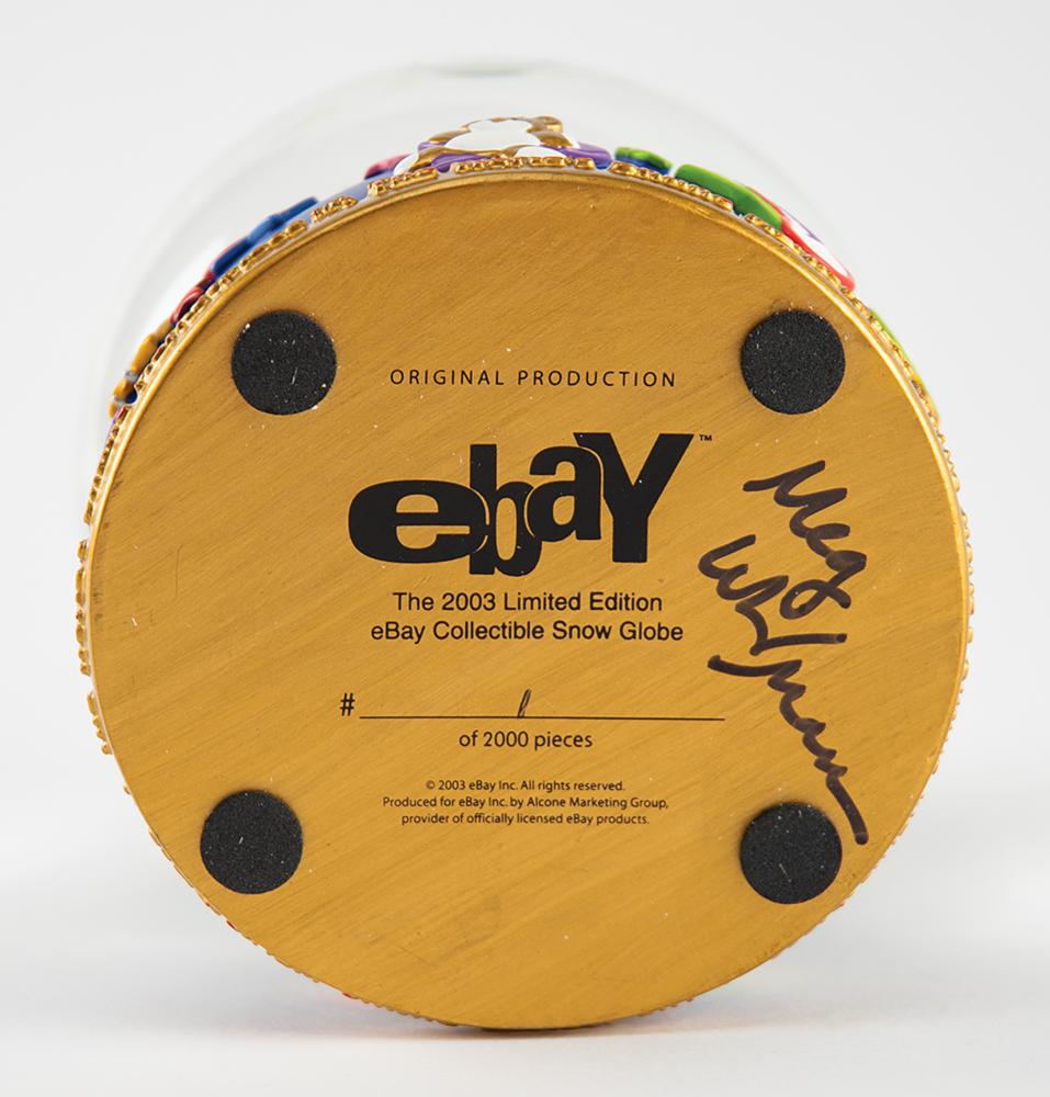 Very desirable limited edition 2003 eBay collectible snow globe, numbered 1/2000, standing 5.5" in height, signed on the underside in black felt tip by Meg Whitman, who served as the company's president and CEO from 1998 to 2008. During Whitman's 10 years with the company, she oversaw its expansion from 30 employees and $4 million in annual revenue, to more than 15,000 employees and $8 billion in annual revenue. Includes the original limited edition box and certificate of authenticity, both of which have matching edition numbers. In fine condition, with wear to box.