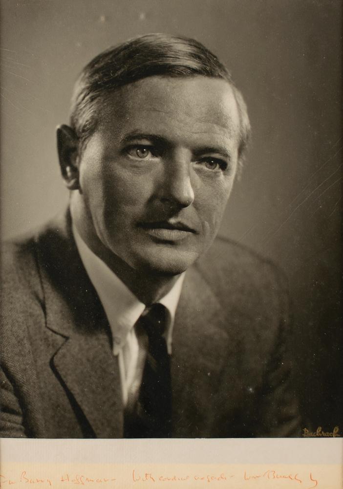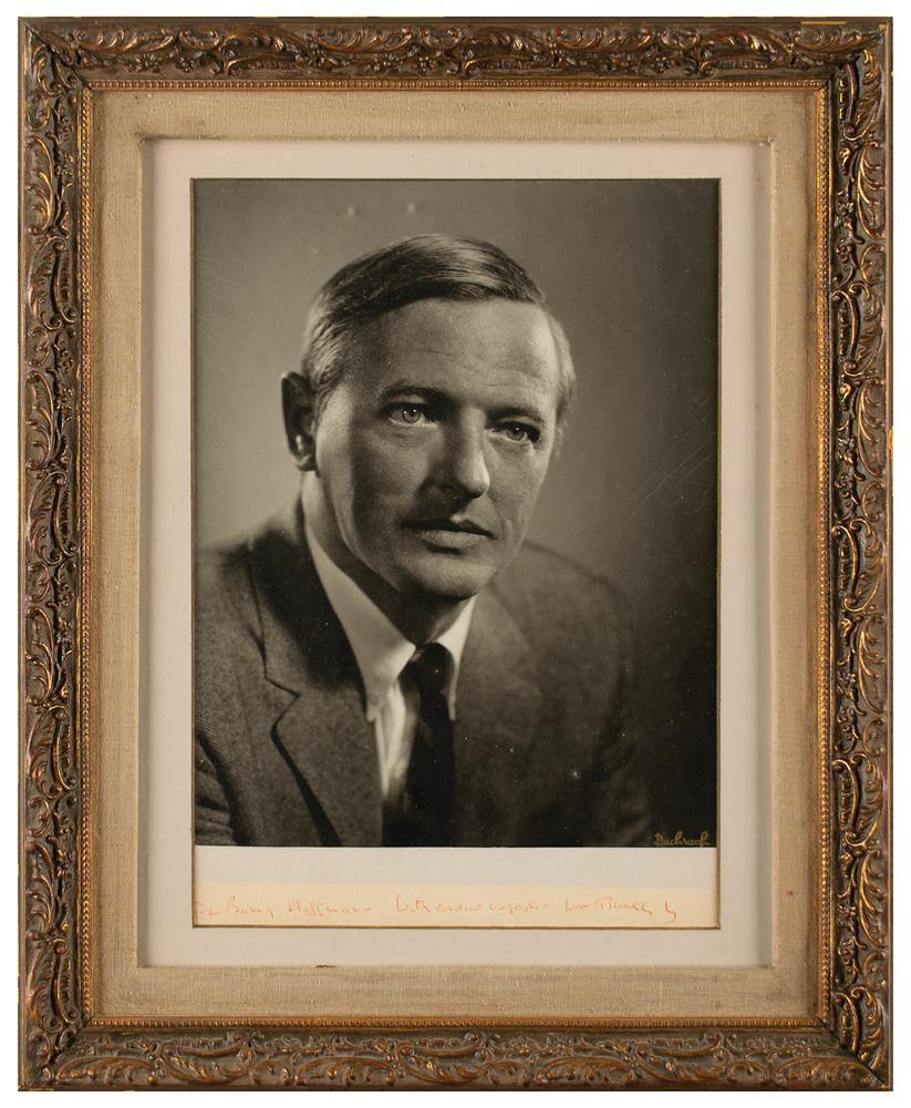 Vintage matte-finish 7.25 x 10.25 Bachrach portrait of the conservative intellectual, signed and inscribed on the original mat in red ballpoint, "To Barry Hoffman—With cordial regards—Wm. F. Buckley.” Matted and framed to an overall size of 12 x 15. In very good to fine condition, with light creasing to the background areas, and light fading to the handwriting.