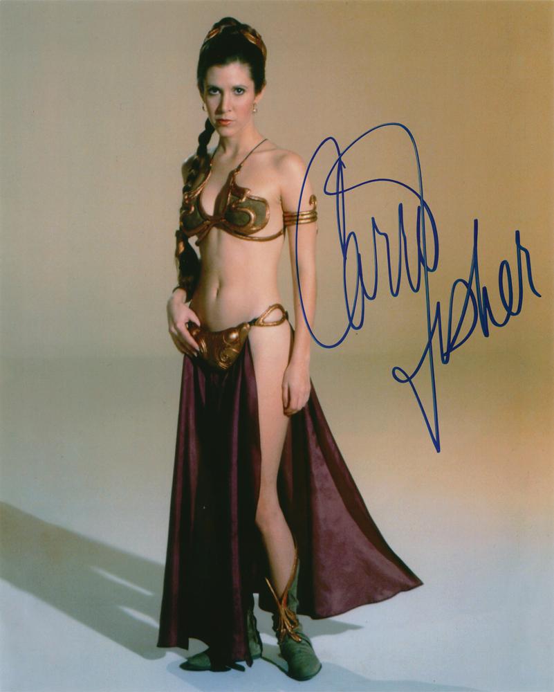 Color satin-finish 8 x 10 full-length photo of Carrie Fisher in her iconic 'Slave Leia' costume in the 1983 Star Wars film Return of the Jedi, signed in blue felt tip. A small label on the reverse states that Fisher signed the autograph at her residence on December 23, 2004. In very good to fine condition, with scattered light creasing, and a small heavier crease to the left background area. Accompanied by a full letter of authenticity from JSA.