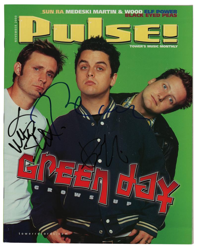 Pulse magazine from November 2000, 88 pages, 8.25 x 10.5, signed on the front cover in felt tip by Billie Joe Armstrong, Mike Dirnt, and Tre Cool. In fine condition, with light handling wear.