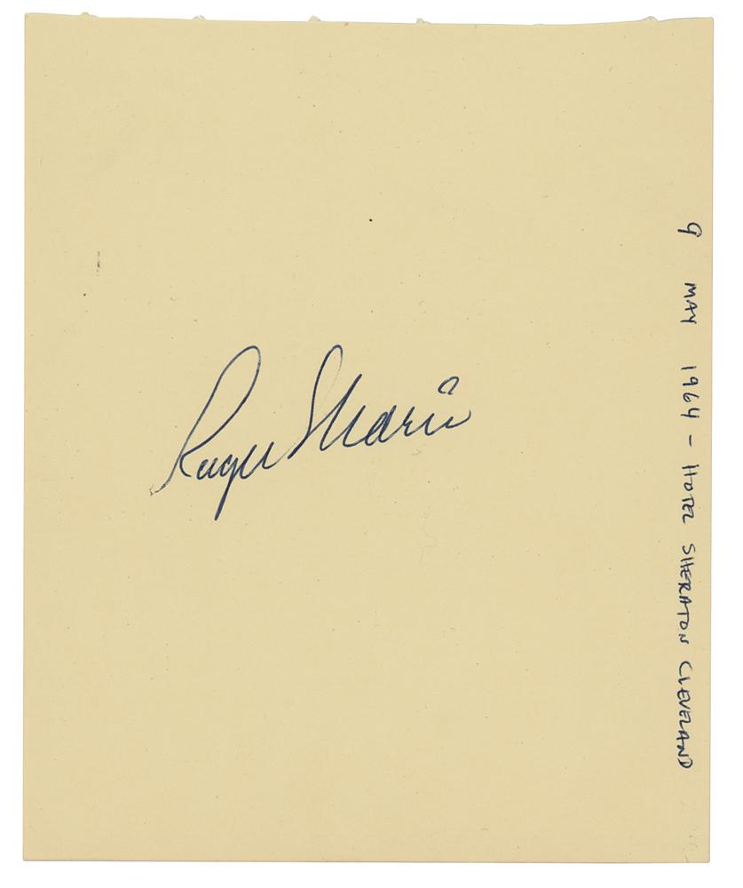 Vintage ballpoint signature, "Roger Maris,” on a yellow 4.5 x 5.5 album page, annotated along the top by the collector: "9 May 1964 - Hotel Sheraton Cleveland." In very fine condition. The New York Yankees were in Cleveland to play a doubleheader against the Indians on May 10th: Maris would go a combined 3/6, slugging a home run and driving in five runs in the first game.