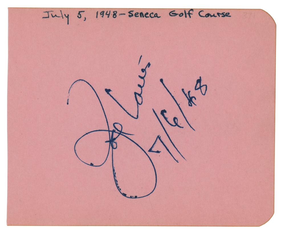Vintage fountain pen signature by the heavyweight champ, "Joe Louis, 7/6/48,” on a pink 5 x 4 album page, annotated along the top by the collector: "July 5, 1948 - Seneca Golf Course." In very fine condition. Louis was relaxing on the links after defending his heavyweight crown: just two weeks earlier, on June 25, 1948, the aging champ knocked out Jersey Joe Walcott before a crowd of 42,000 at Yankee Stadium to retain his title.