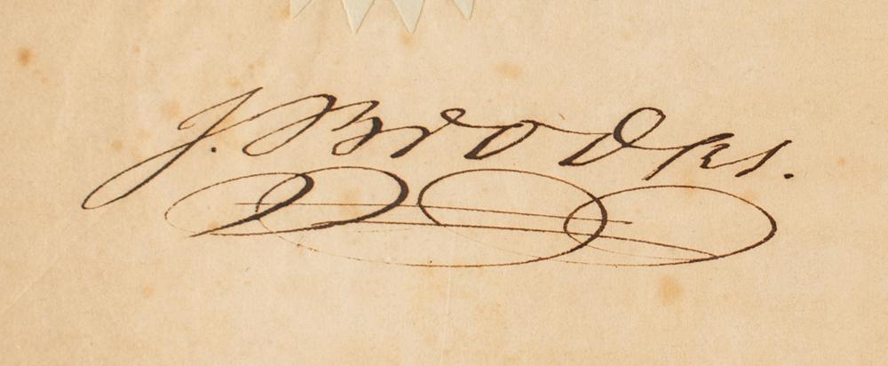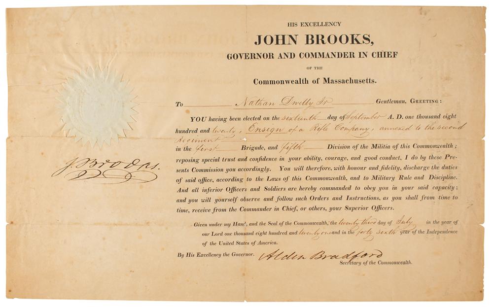 Doctor, military officer, and politician (1752-1825) who led his militia in the Battles of Lexington and Concord, served under George Washington in the New York and New Jersey campaign of 1776, and became the 11th governor of Massachusetts. Partly-printed DS, signed “J. Brooks,” one page, 15.75 x 9.75, July 23, 1821. As governor of Massachusetts, Brooks appoints Nathan Dwelly Jr. as "Ensign of a Rifle Company, annexed to the second Regiment in the first Brigade, and fifth Division of the Militia of this Commonwealth." Signed in the upper left by Governor Brooks, and countersigned at the conclusion by Secretary of the Commonwealth Alden Bradford. The white paper seal affixed to the upper left remains intact. In very good to fine condition, with scattered light foxing and staining.