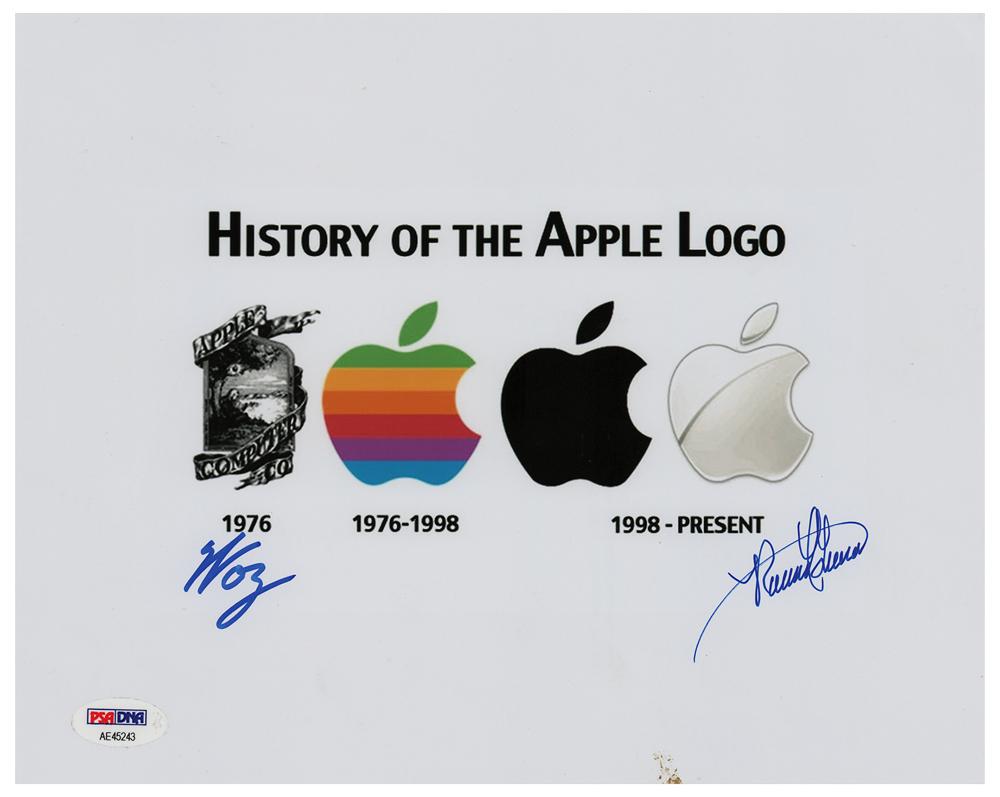 Color satin-finish 10 x 8 photo of the history of the Apple Computer logo, signed in blue felt tip by two of Apple's co-founders: Steve Wozniak, "Woz," and Ron Wayne, "Ronald G. Wayne." In fine condition, with a small stain to the bottom edge and with a PSA/DNA label affixed to the lower left corner (certificate of authenticity not present).