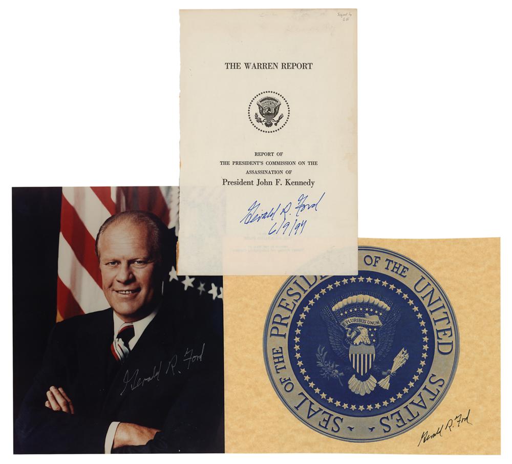 Three items: the title page from a published volume of The Warren Report, 6.75 x 9.75, signed in blue ink, "Gerald R. Ford, 6/9/94"; a 10.25 x 8 cardstock photo of the American presidential seal, signed in black felt tip, "Gerald R. Ford"; and a color glossy 8 x 10 photo, signed in silver ink , "Gerald R. Ford." In overall fine condition.
