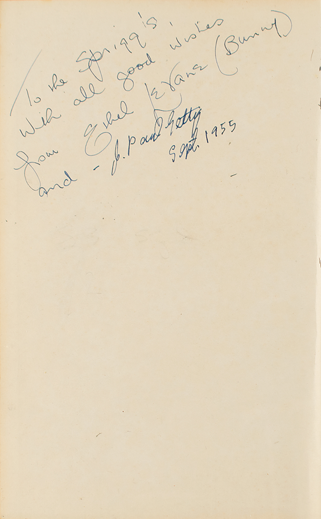 Signed book: Collector's Choice: The Chronicle of an Artistic Odyssey Through Europe. First edition. London: W. H. Allen, 1955. Hardcover, 6 x 8.75, 360 pages. Signed opposite the half-title page in fountain pen, "J. Paul Getty, Sept. 1955," with an inscription by his co-author above, "To the Sprigg's, with all good wishes from Ethel LeVane (Bunny)." In fine condition, with minor rubbing to boards and some pencil marginalia throughout.