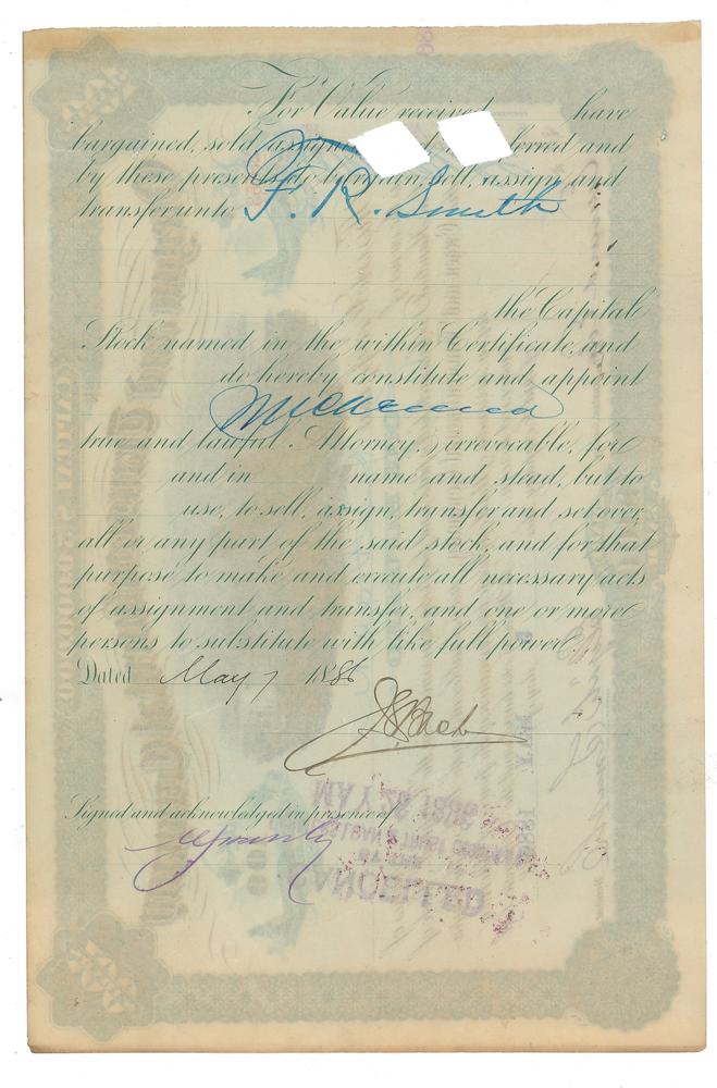 American banker, art collector, and philanthropist (1861-1944) whose stock brokerage firm, J. S. Bache & Co., was one of the top brokerage houses in the United States. Partly-printed DS, signed "J. S. Bache," one page, 10.75 x 7, May 5, 1886. Certificate for 100 shares of stock in the Oregon and Transcontinental Company issued to J. S. Bache, signed on the reverse by Bache; the front is signed at the bottom by Elijah Smith as the company's president. The certificate boasts a handsome vignette of Native American Indians observing a train in a valley. In fine condition, with two triangular cancellation holes to the left side.