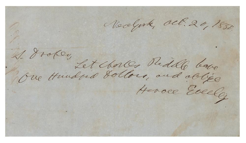 Founder and editor of the New York Tribune (1811-1872) who used the power of his newspaper to advocate for a variety of liberal causes, most importantly the call for emancipation of slaves during the Civil War. ANS, one page, 7 x 4, October 20, 1850. Handwritten note from New York, addressed to "Draper," in full: "Let Charles Riddle have one hundred dollars, and oblige." In fine condition, with scattered light staining.