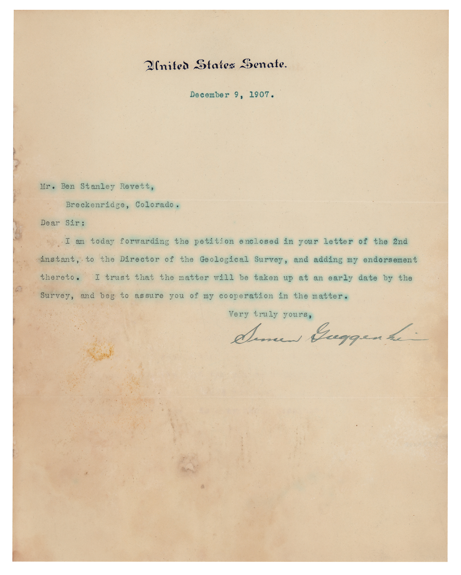 American businessman, politician, and member of the esteemed Guggenheim family (1867-1941) who served as the senator of Colorado from 1907 to 1913. TLS, one page, 8 x 10, United States Senate letterhead, December 9, 1907. Letter to noted Colorado miner Benjamin Stanley Revett, known as the 'Father of Gold Dredging in the United States,' in full: "I am today forwarding the petition enclosed in your letter of the 2nd instant, to the Director of the Geological Survey, and adding my endorsement thereto. I trust that the matter will be taken up at an early date by the Survey, and beg to assure you of my cooperation in the matter." In very good to fine condition, with areas of light dampstaining.