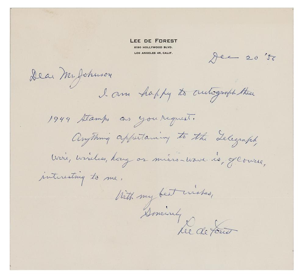 Prolific American inventor (1873-1961) often referred to as 'the father of radio' for his pioneering work in wireless telegraphy. ALS, one page, 8.25 x 7.75, personal letterhead, December 20, 1956. Handwritten response to a collector, in part: "I am happy to autograph these 1949 stamps as you request. Anything appertaining to the Telegraph, wire, wireless, long or micro-wave is, of course, interesting to me." In fine condition.