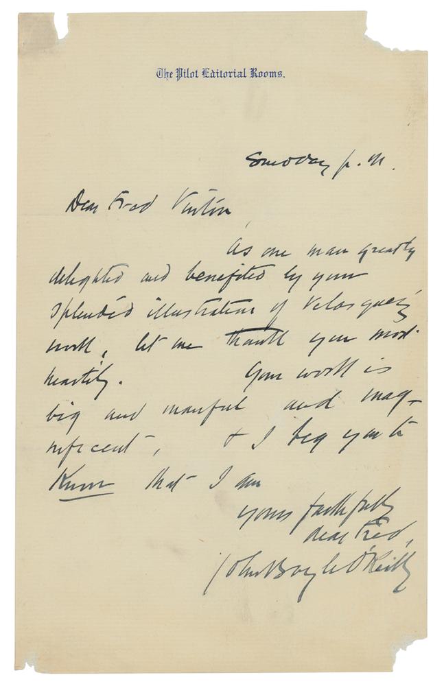 Irish poet, journalist, author, and activist (1844-1890) who was transported to Western Australia for his association with the Irish Republican Brotherhood (the 'Fenians'); he escaped the colony in 1869 and settled in Boston, where he found work as a poet and reported for The Pilot. ALS signed "John Boyle O'Reilly," one page, 5.5 x 9, The Pilot Editorial Room letterhead, no date. Handwritten letter, in part: "As one man greatly delighted and benefitted by your splendid illustration of Velasquez's work, let me thank you most heartily. Your work is big and manful and magnificent." In very good to fine condition, with losses to corners.