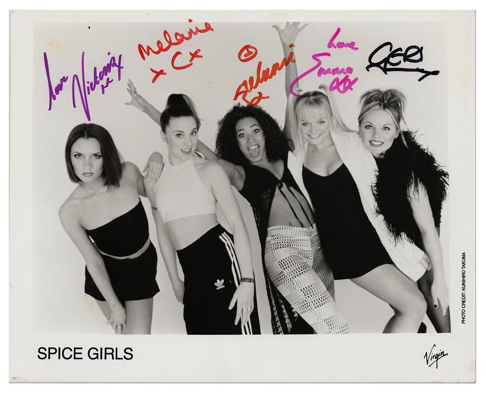 Satin-finish 10 x 8 Virgin Records publicity photo of the Spice Girls, signed in various inks by Victoria Beckham, Melanie Chisholm, Melanie Brown, Geri Halliwell, and Emma Bunton, all signing with first names only. In very good to fine condition, with scattered small creases, and a bend to the upper right corner area.