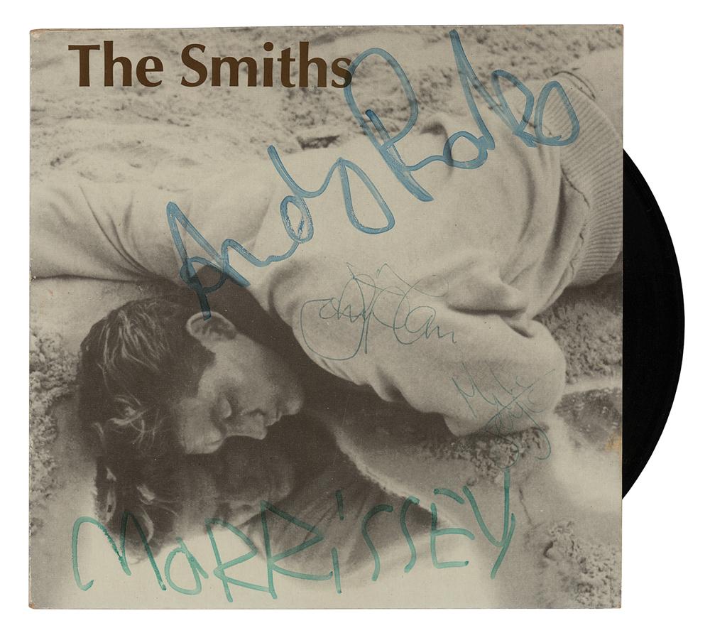 Rough Trade 45 RPM record for the single 'This Charming Man / Jeane' by The Smiths, signed on the front cover in felt tip by Morrissey and Andy Rourke, and in ballpoint by Johnny Marr and Mike Joyce. In fine condition. The rare solid center vinyl record is included.