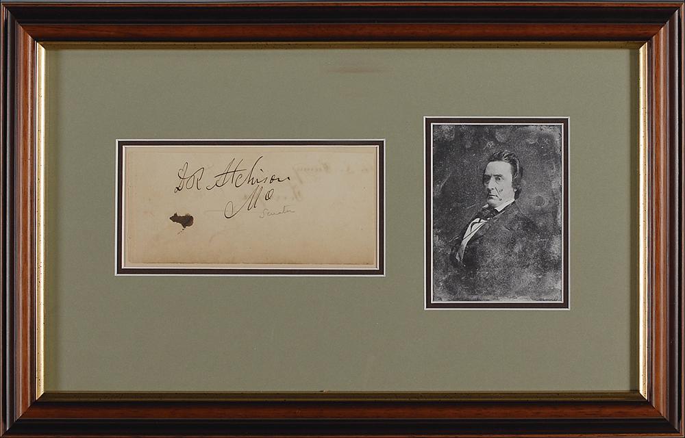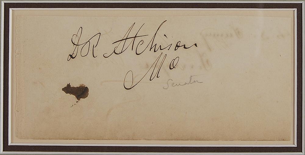 American politician (1807-1886) best remembered as the subject of a controversy over whether, as President Pro Tempore of the Senate, he technically served one day as U.S. President in 1849 when Zachary Taylor declined to be inaugurated on the Sabbath. Though the unusual circumstances have since been widely analyzed and the notion of Atchison's presidency discounted, the legend of his "tenure" has become an enduring fixture of American political folklore. Ink signature, "D. R. Atchison, Mo.," on an off-white album page. Attractively double-matted and framed with a portrait of Atchison to an overall size of 16 x 10. In fine condition, with light show-through from writing on the reverse.