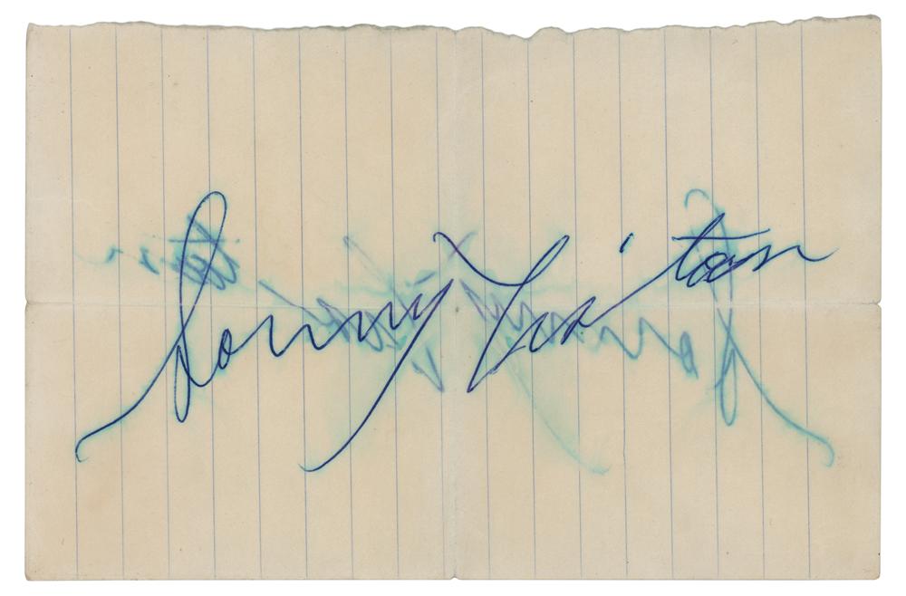 Vintage ballpoint signature, "Sonny Liston,” on an off-white 6.25 x 4 lightly-lined sheet. In very good to fine condition, with intersecting folds, and offsetting of the signature from having been folded.