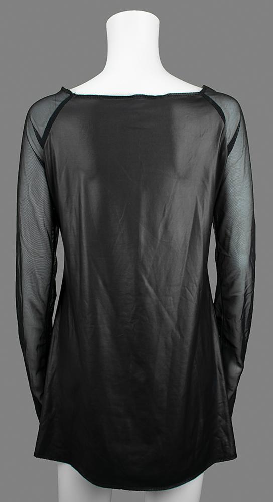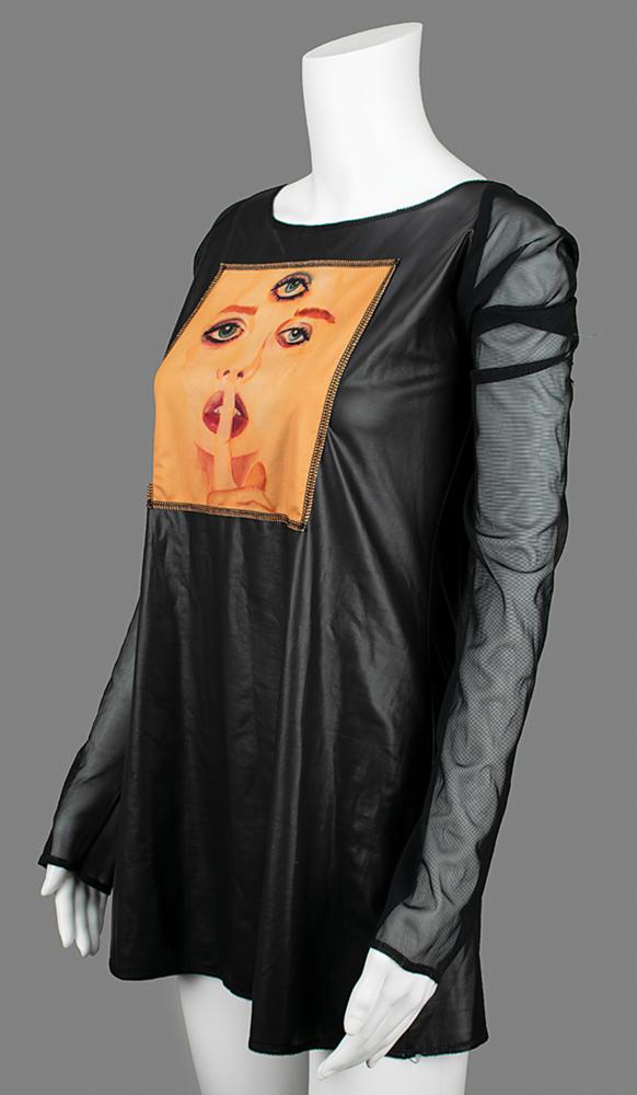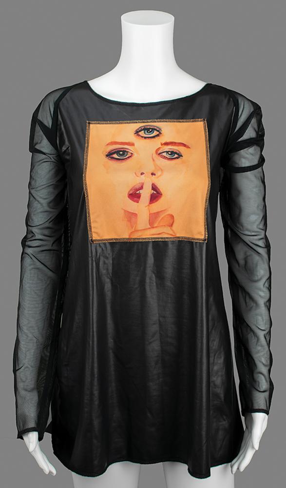 Long-sleeved shirt made for Prince and his funk rock backing band 3rdeyegirl to promote the release of their album Plectrumelectrum in 2014. The top, size XL, features a 3rdeyegirl emblem sewn onto the body, with sheer nylon sleeves. In fine condition, with minor fraying at the neck. From the personal collection of Sara Savoy, who notes that this was purchased at Paisley Park during a party Prince had there.