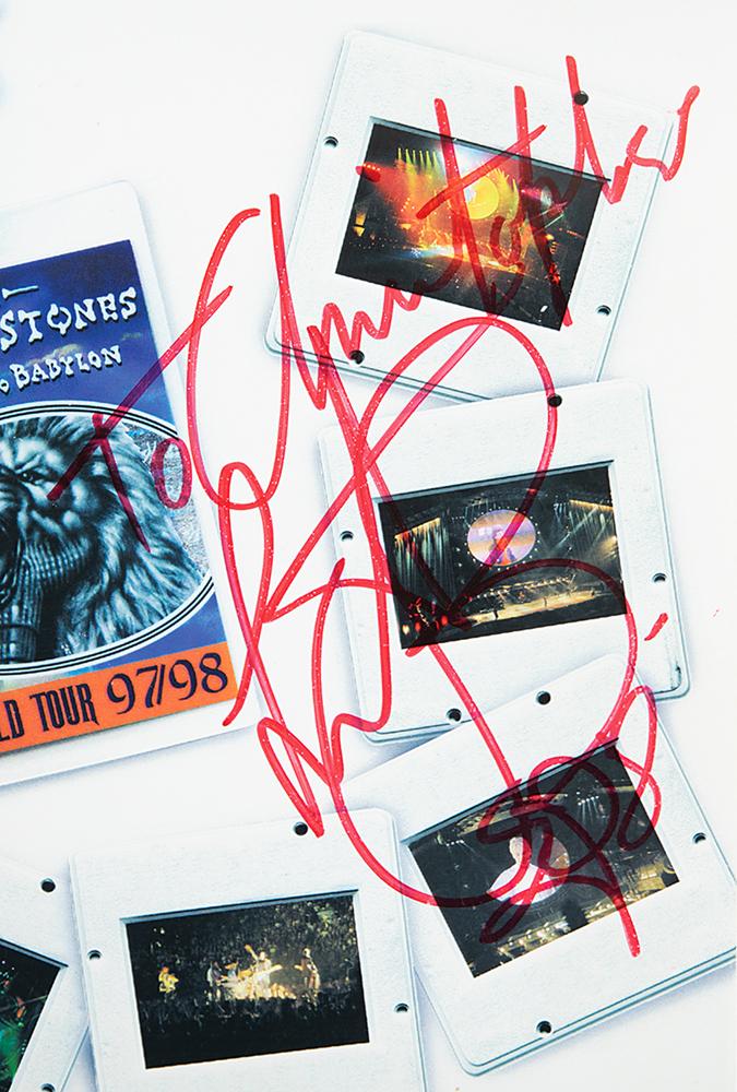 Spiral-bound schedule and itinerary for the Rolling Stones' 1998 'Bridges to Babylon' World Tour, 5.75 x 8.5, signed on the front cover in red felt tip by Charlie Watts, adding an inscription, "To Christopher." The book covers the tour from August 15-September 20, 1998, which included shows in Croatia, Czech Republic, Germany Holland, Sweden, Greece, and Turkey. In fine condition, with some light warping.