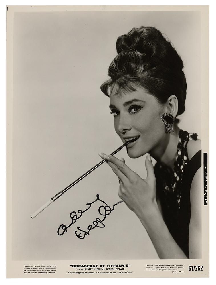 Stunning glossy 8 x 10 promo photo of Hepburn in her iconic role as Holly Golightly in the 1961 film Breakfast at Tiffany's, signed in black felt tip. In fine condition. Accompanied by a brief provenance statement stating that the autograph was obtained in San Francisco while she was there to film Love Among Thieves.