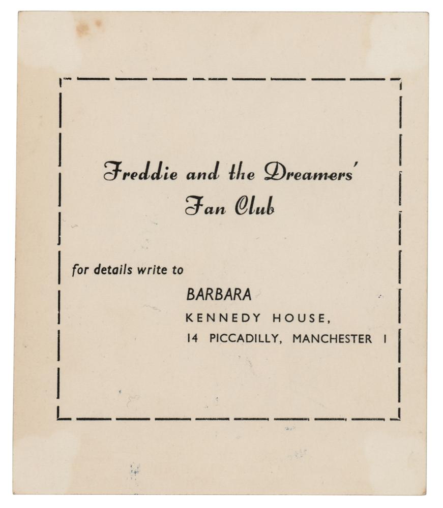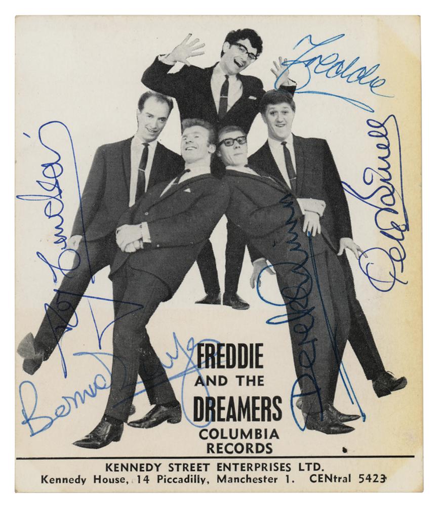 Vintage Freddie and the Dreamers fan club card, 4 x 4.5, showing the well-dressed band as part of the Columbia Records musical roster, signed nicely in ballpoint by Freddie Garrity, Roy Crewdson, Derek Quinn, Peter Birrell, and Bernie Dwyer. In fine condition, with light toning along the right edge.